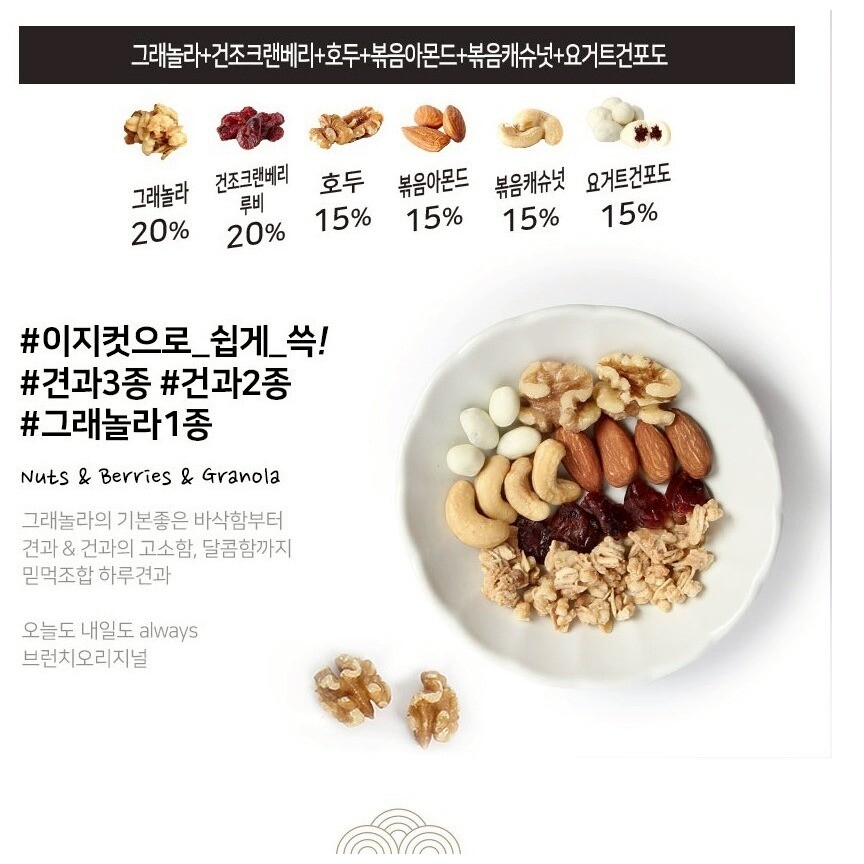 ░穀麥20%/蔓越莓乾20%/核桃15%/炒杏仁15%/炒腰果15%/優格葡萄乾15%