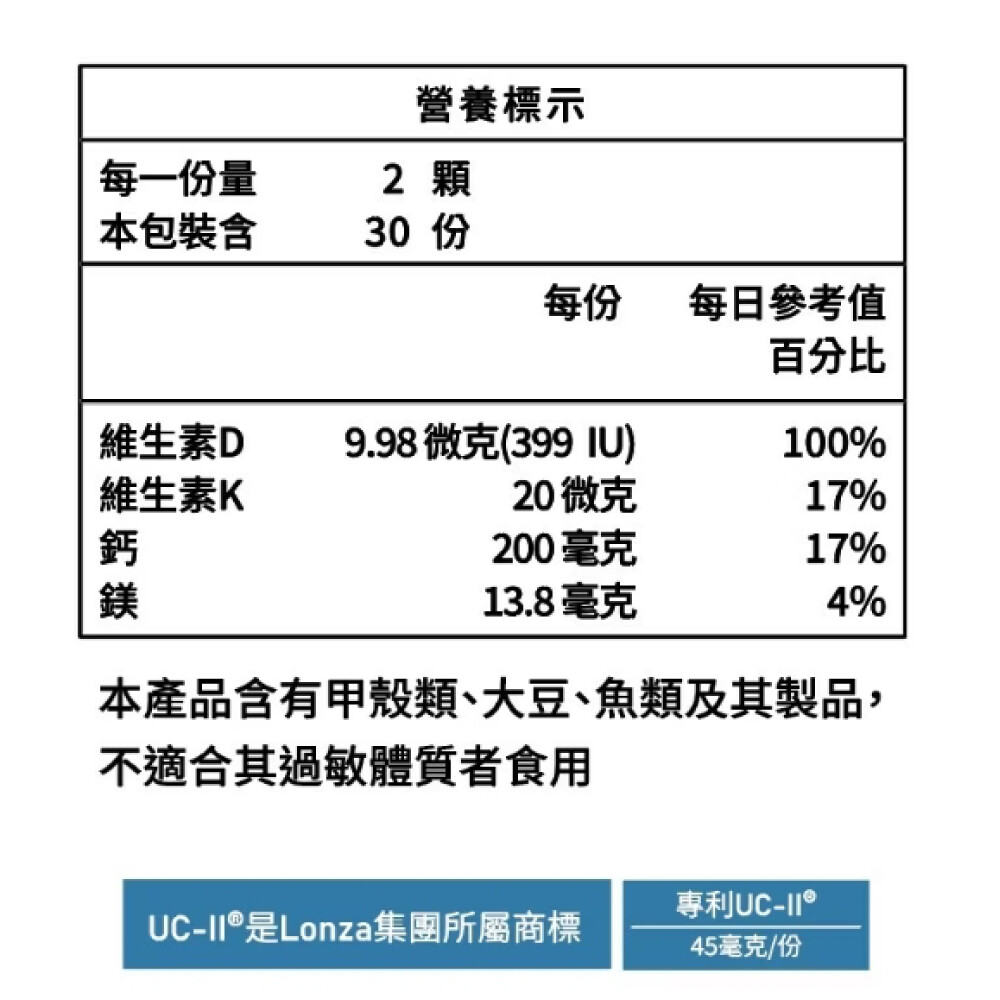 內容物:紅藻粉(含海藻鈣)、葡萄糖胺鹽酸鹽、鯊魚軟骨粉、UC-II®專利膠原蛋白複合物(雞胸軟骨粉(含非變性二型膠原蛋白)、氯化鉀)、微結晶狀α-纖維素、流行鏈球菌發酵物(含透明質酸鈉)、二氧化矽、納豆菌萃取物(含維生素K2)(麥芽糊精、辛烯基丁二酸鈉澱粉、中鏈三酸甘油酯、納豆菌萃取物)、維生素D3(辛烯基丁二酸鈉澱粉、蔗糖、L-抗壞血酸鈉(抗氧化劑)、中鏈三酸甘油酯、二氧化矽、維生素E(抗氧化劑)、維生素D3)