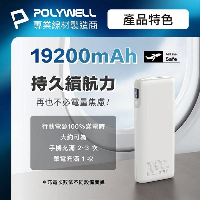 【19200mAh大容量】電池容量(<100Wh)可帶上飛機,且足夠外出一整天的行程使用