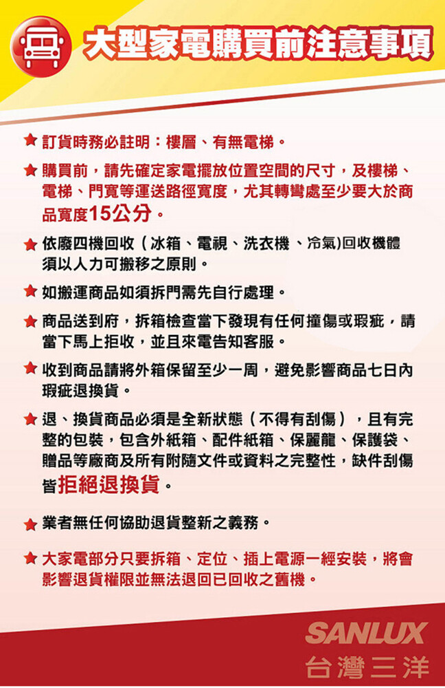 ◎大型家電為專車配送出貨,廠商收到訂單後(不含假日),將有專人與您聯繫確認訂單資訊及環境尺寸評估等(前置作業),客人需如實告知現場情況,若未如實告知產生費用,例如 : 需拆窗或商品抬過腰(一些特殊情況)都會產生額外費用 (請現場支付給師父),請務必保持電話暢通,若無法聯繫將無法安排出貨,則影響配送時間