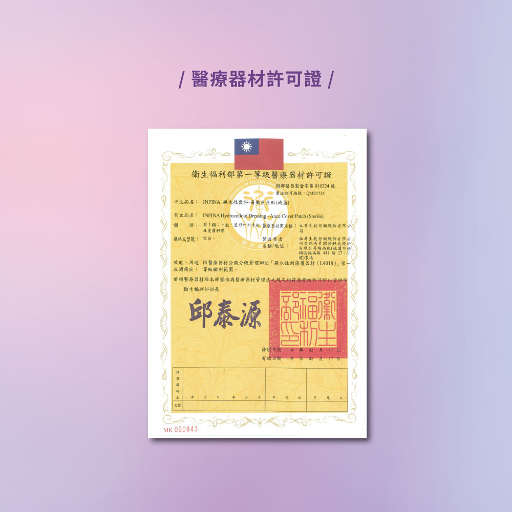 (1.) 醫療器材品名:INFINA 親水性敷料 易撕痘痘貼(滅菌)