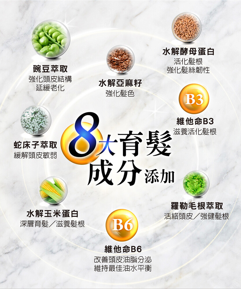 ‧獨家育髮活性成分添加,能強化滋養頭皮,幫助活絡、強健髮根,使頭髮呈現豐盈感。