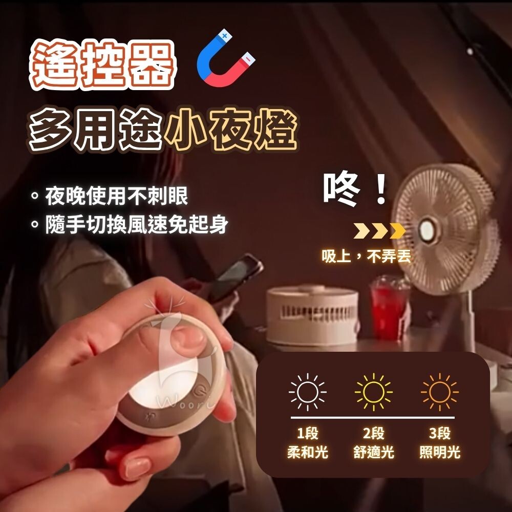。磁吸式遙控器,可以吸在風扇正面、可以當小夜燈