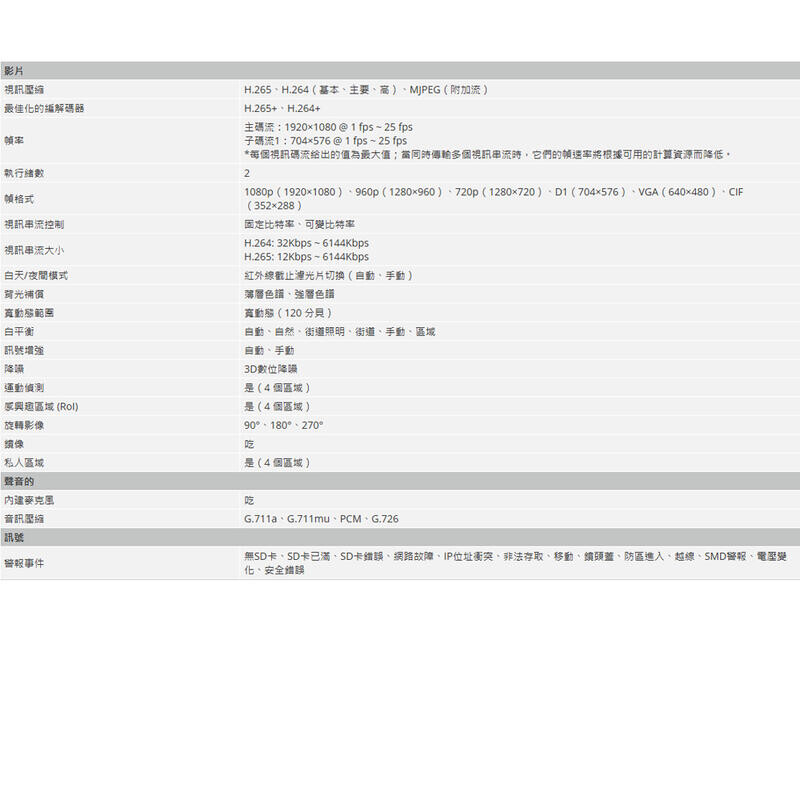 >最大視訊串流 2 MP (1920×1080) @ 25 fps