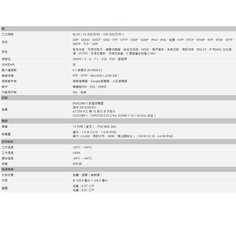 >智慧區域和越線功能(人員、交通分類和> MicroSD 高達 256 GB,內建麥克風>電源 12 V (DC),PoE