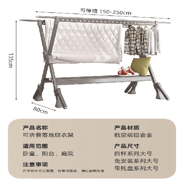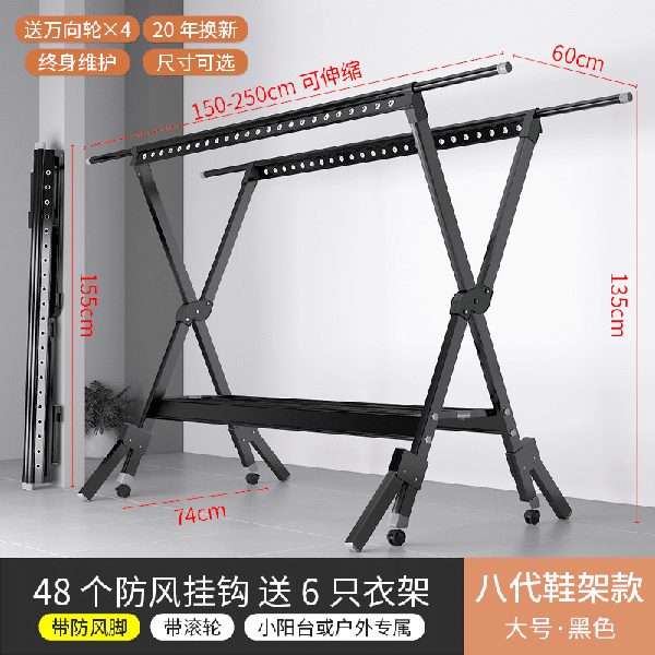 品牌其他顏色黑色產地中國特點耐重、防水、可折疊材質鋅合金類型曬衣架款式X型適用場所臥室、客廳、陽台層數2層組裝方式自行組裝保固保固種類: 供應商保固 保固期限: 90天尺寸長度: 250cm 寬度: 74cm 高度: 135cm