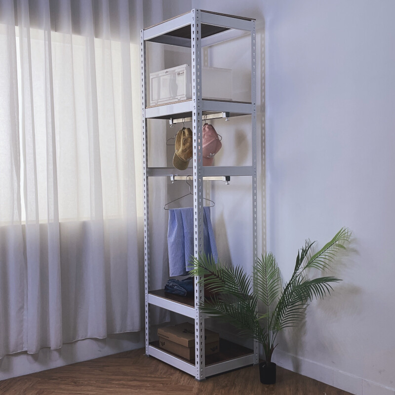 這款免螺絲角鋼衣櫃搭配雙桿吊衣桿設計,上下吊掛分層,空間翻倍利用,長短衣物分類更清晰。下方層板可收納摺疊衣物、收納箱、鞋盒等物品,上方則可用來吊掛外套、襯衫或長洋裝,讓收納變得更加有條不紊。層板與吊桿皆可依需求調整高度,真正打造屬於你的模組化開放式衣櫃。