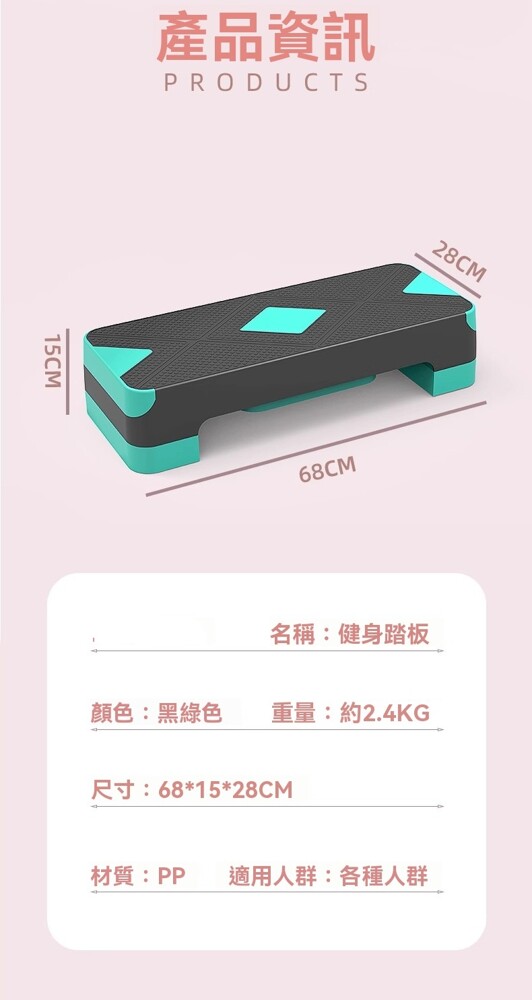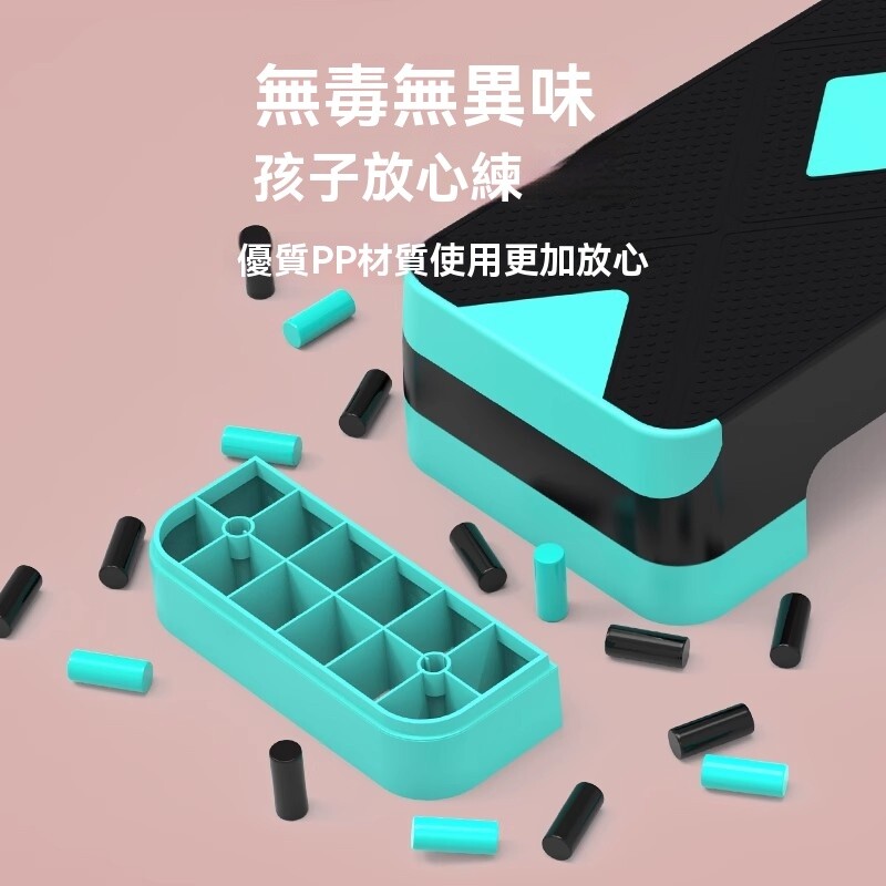 特點:有氧運動健身踏板 三檔進階 高度可調 穩定防滑 不晃動 凸點防滑紋路 防滑性能更強 安全系數更高 健身踏板操 平板支撐 身體平衡訓練 收納方便 節省空間 顔色:黑綠色 重量:約2.4KG 材質:PP 適用人群:各種人群