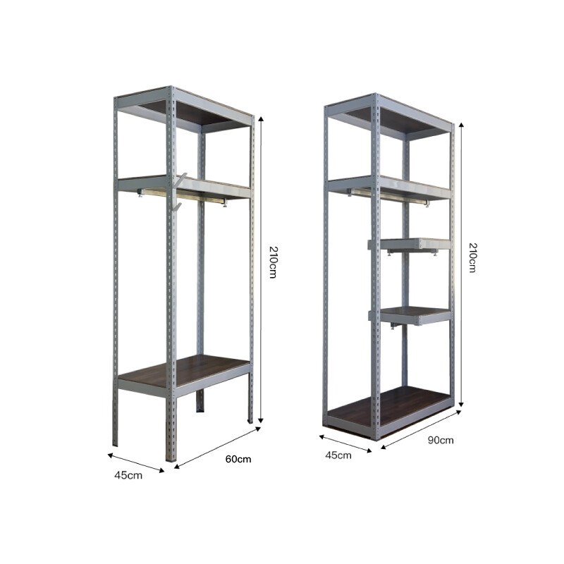 這款免螺絲角鋼衣櫃搭配雙桿吊衣桿設計,上下吊掛分層,空間翻倍利用,長短衣物分類更清晰。下方層板可收納摺疊衣物、收納箱、鞋盒等物品,上方則可用來吊掛外套、襯衫或長洋裝,讓收納變得更加有條不紊。層板與吊桿皆可依需求調整高度,真正打造屬於你的模組化開放式衣櫃。