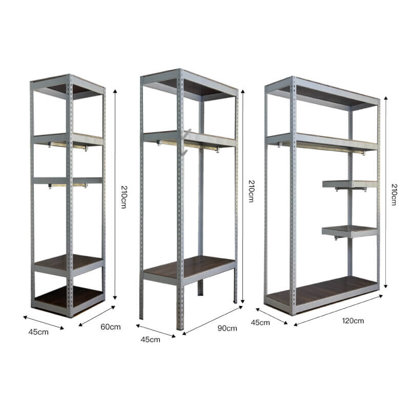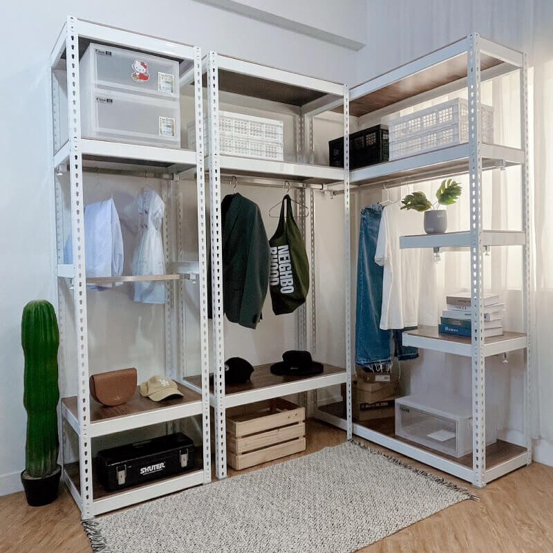 這款免螺絲角鋼衣櫃搭配雙桿吊衣桿設計,上下吊掛分層,空間翻倍利用,長短衣物分類更清晰。下方層板可收納摺疊衣物、收納箱、鞋盒等物品,上方則可用來吊掛外套、襯衫或長洋裝,讓收納變得更加有條不紊。層板與吊桿皆可依需求調整高度,真正打造屬於你的模組化開放式衣櫃。
