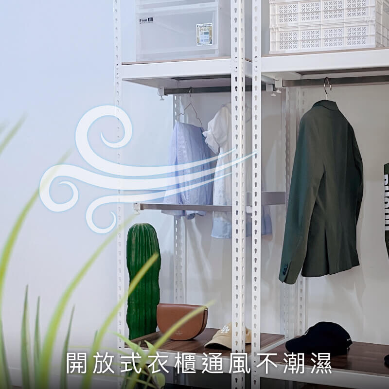 • 開放式設計通風不悶熱,適合衣物長期掛放