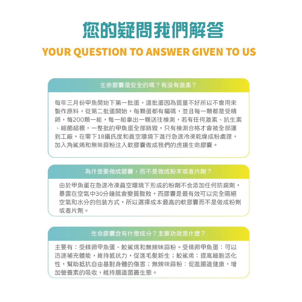 成份:鮫鯊烯、受精卵甲魚蛋、無辣味蒜粉(含Allicin2%)、亞麻籽油