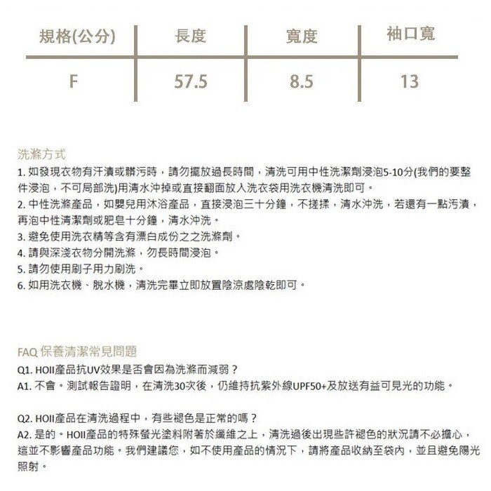 – 規格(公分):長度57.5 / 寬度8.5 / 袖口寬13