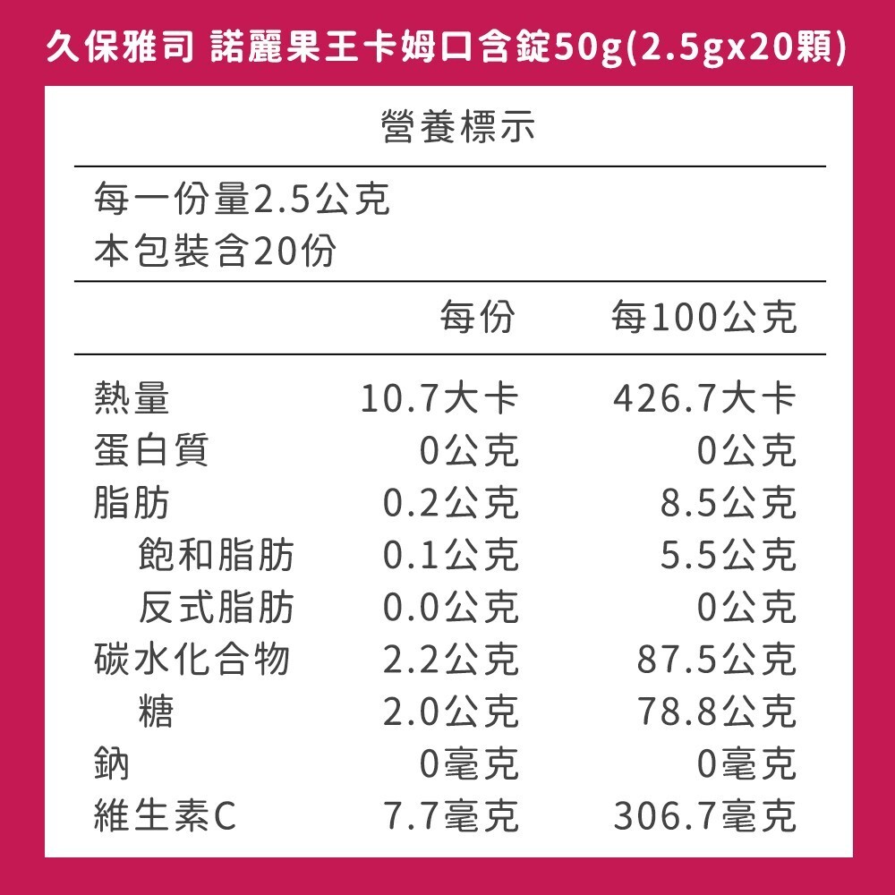 成分:砂糖、麥芽糖、椰子油、阿拉伯膠、檸檬酸(調味劑)、檸檬濃縮果汁、香料、維生素C、香檬精華濃縮物(噴霧乾燥)、諾麗果醱酵濃縮粉(冷凍乾燥)、卡姆果萃取物(卡姆果、麥芽糊精)、天然食用色素(薑黃)、薄荷、棕櫚蠟(食品製造用劑)