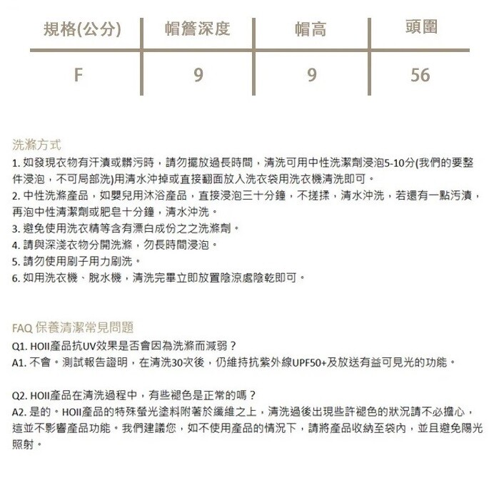 – 規格(公分):帽簷深度9 / 帽高9 / 頭圍56