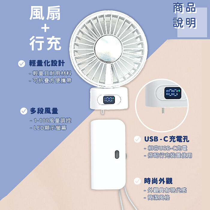 Wephone 5000mAh 隱藏直插式/數顯20W快充行動電源+USB半導體冰風扇(雙向自帶線/可充手錶)