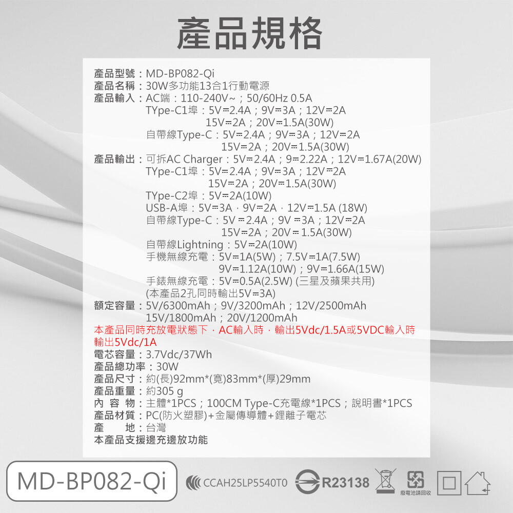 MINIQ 台灣製造10000mAh 30W多功能磁吸無線充行動電源(手錶/耳機/自帶線/可拆卸充電頭)