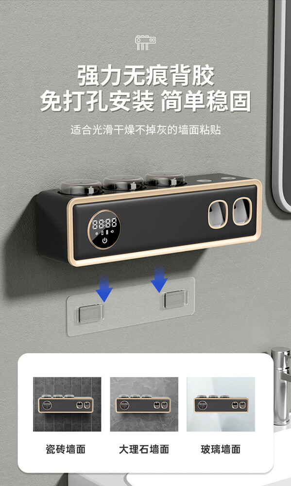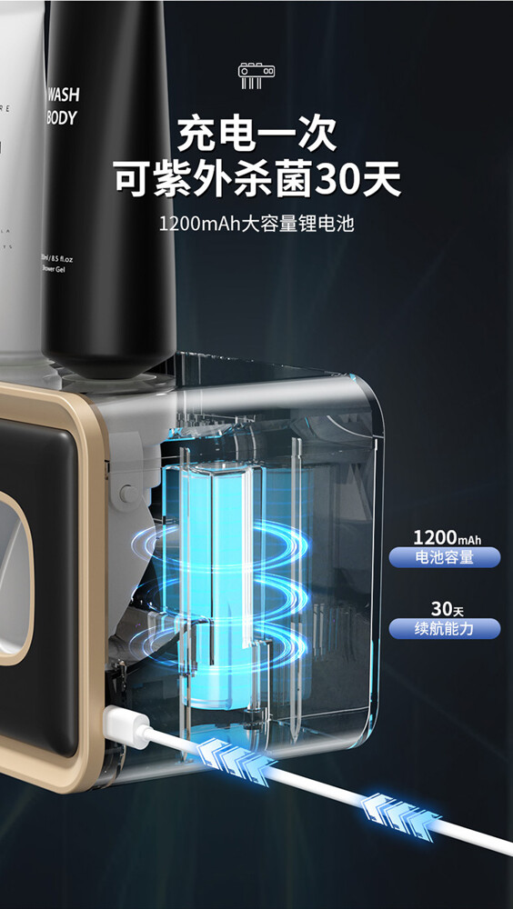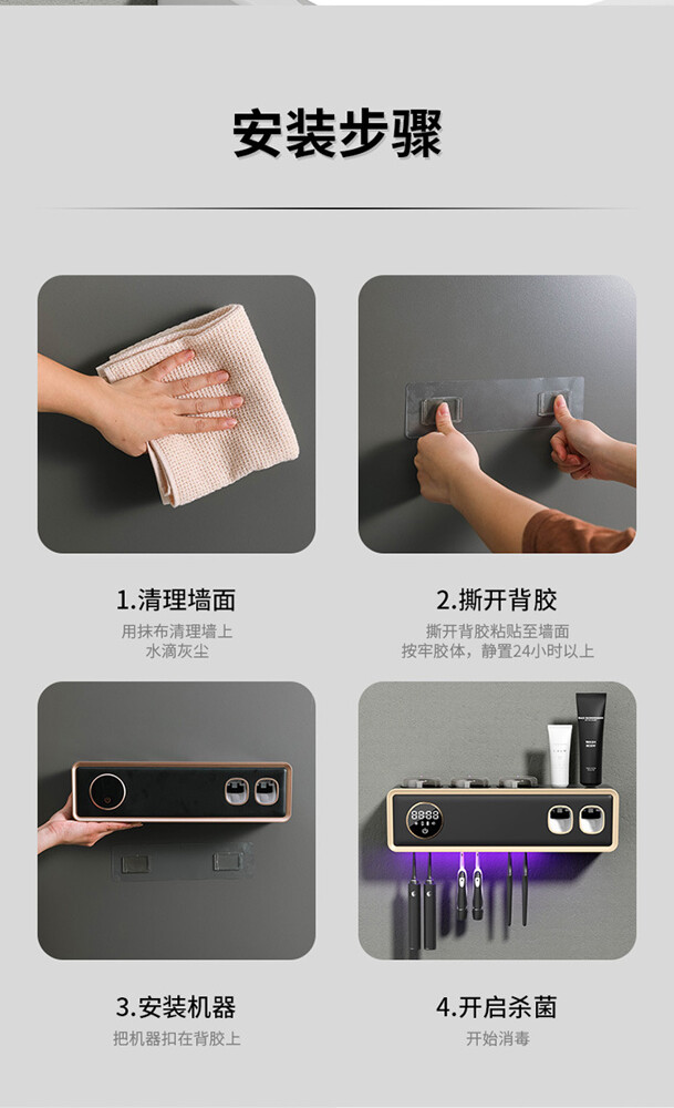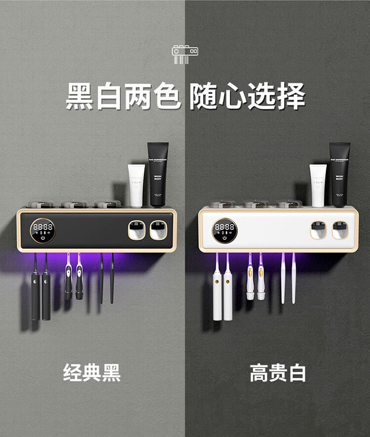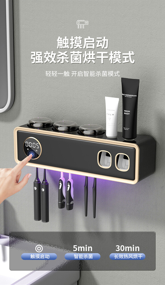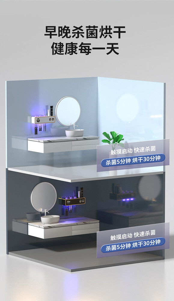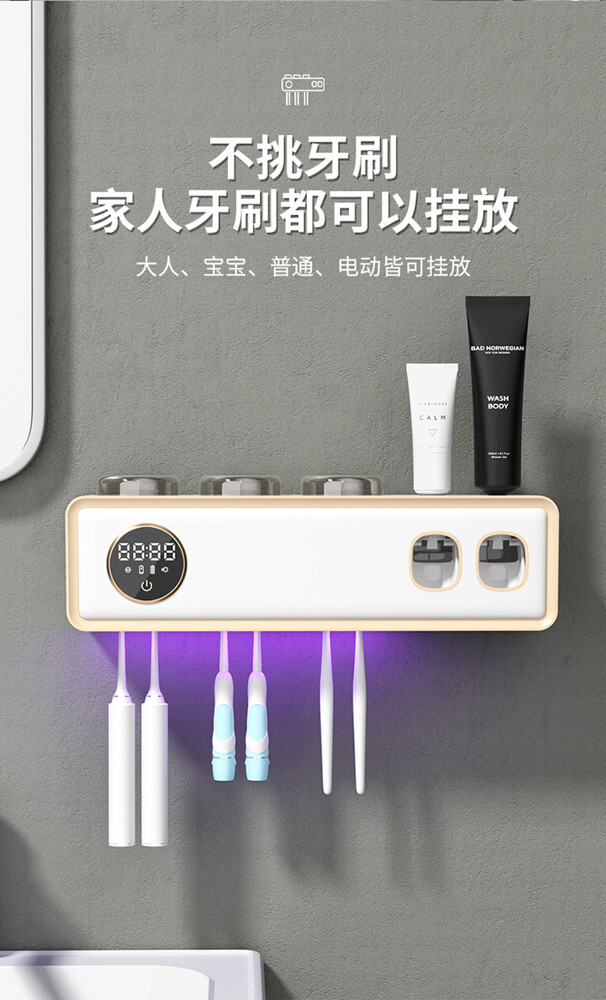 産品名稱 智能牙刷消毒烘幹器 材質 ABS+PS 電池容量 1200mAh 産品尺寸 36.8 (L) *9.3 (W)*10 (H) 厘米 有烘幹 牙刷牙杯同時殺菌 搭載UVC深紫外 全面深度消滅細菌 43°C熱風吹幹牙刷牙杯 抑制細菌反複滋生