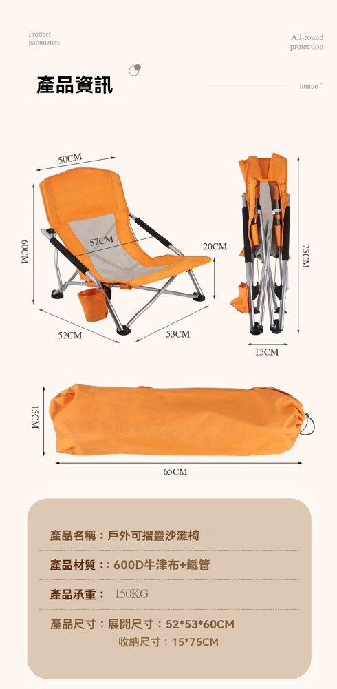品牌其他產地中國特點可折疊、可收納類型折疊椅子顏色藍色、橙色材質鐵、尼龍座位數1人適用場所戶外、露營、野餐、釣魚組裝方式免組裝尺寸長度: 52cm 寬度: 53cm 高度: 60cm 商品重量: 3.5kg 可承重量: 150kg保固保固種類: 供應商保固 保固期限: 90天