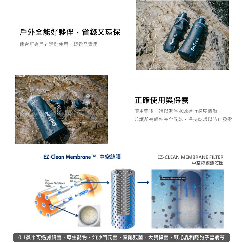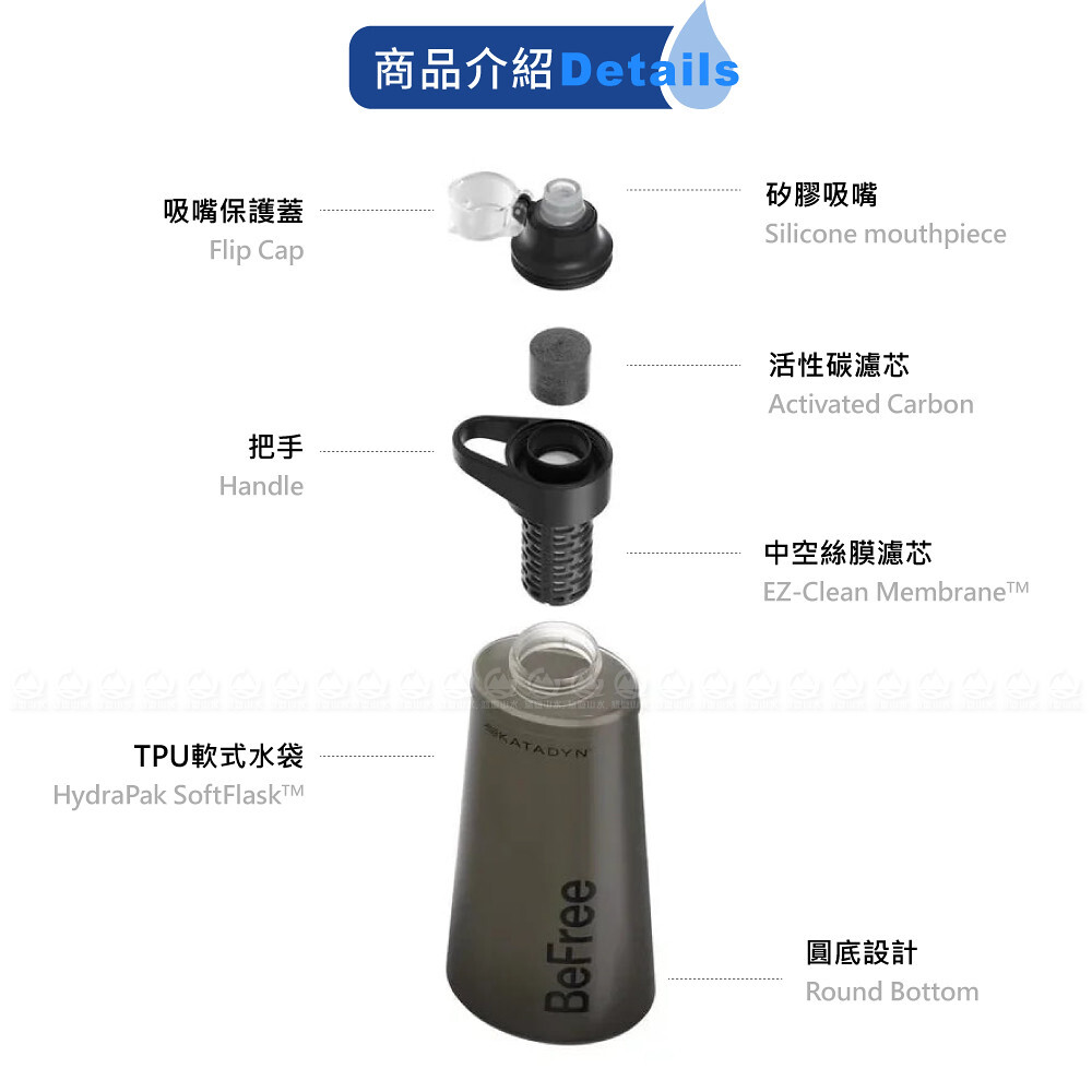 材質:EZ-Clean Membrane™ with Hollow Fibers 中空絲膜濾心/ Replaceable activated carbon可替換式活性碳濾芯 / Hydrapak® SoftFlaskTM made of TPU (100% PVC and BPA free) TPU水袋