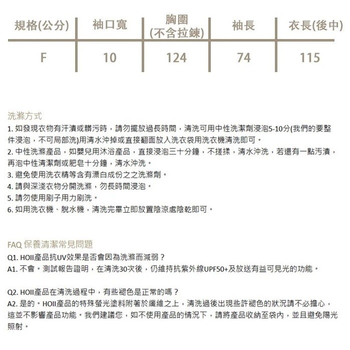 – 規格(公分):袖口寬10 / 胸圍(不含拉鍊)124 / 袖長74 / 衣長(中後)115