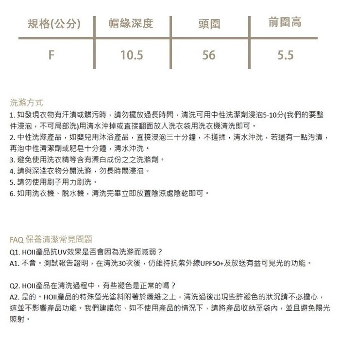 – 規格(公分):帽簷深度10.5 / 頭圍56 / 前圍高5.5