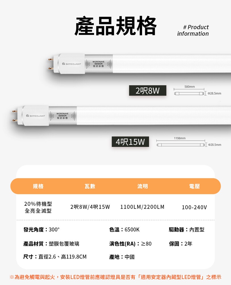 ※為避免觸電與起火,安裝LED燈管前應確認燈具是否有「適用安定器內藏型LED燈管」之標示