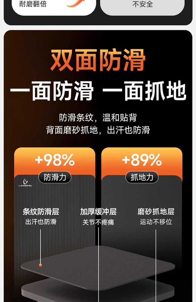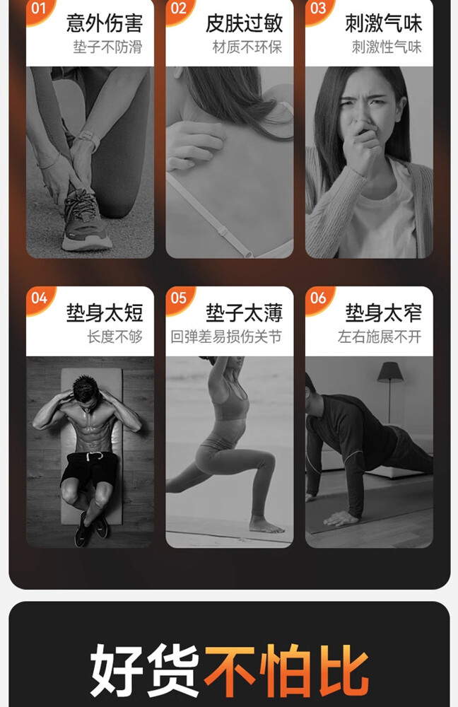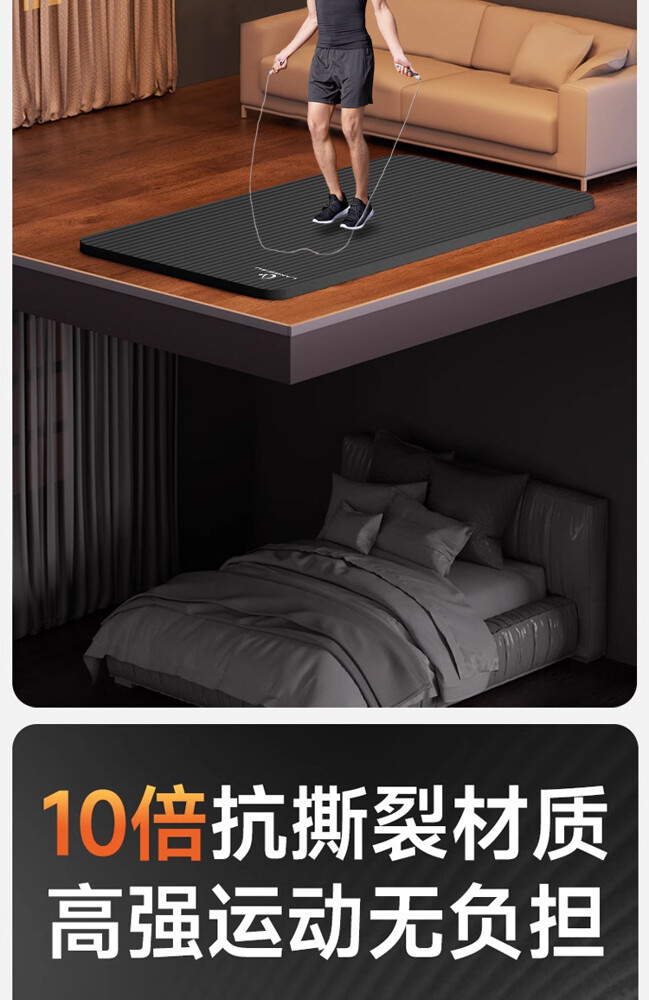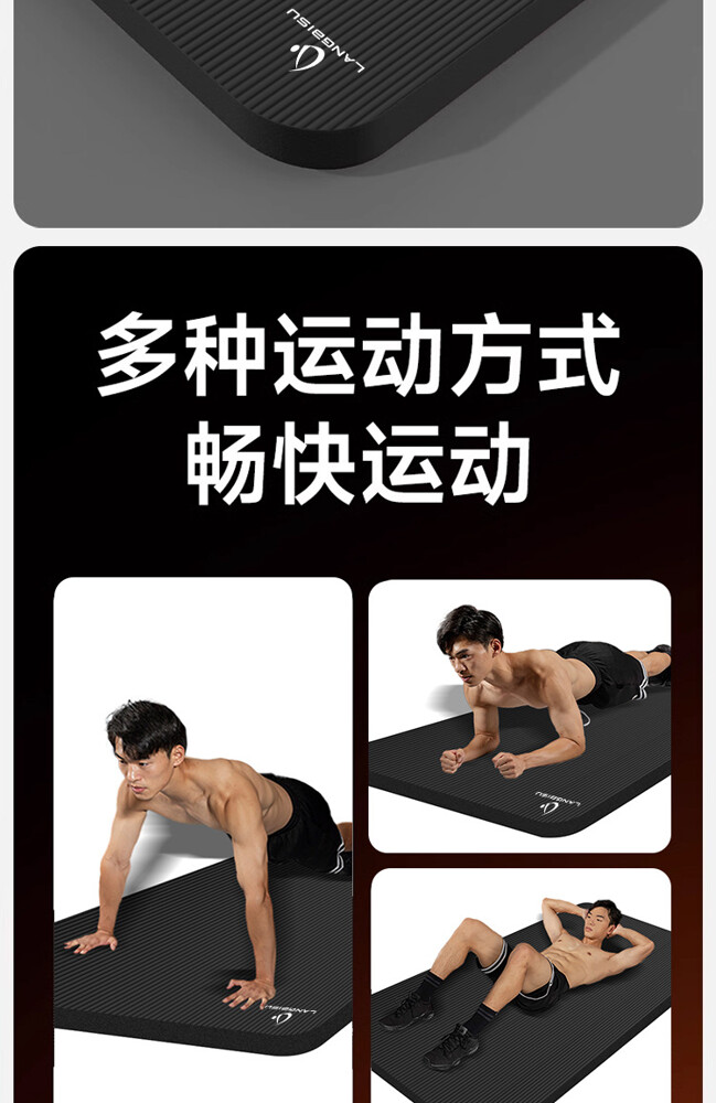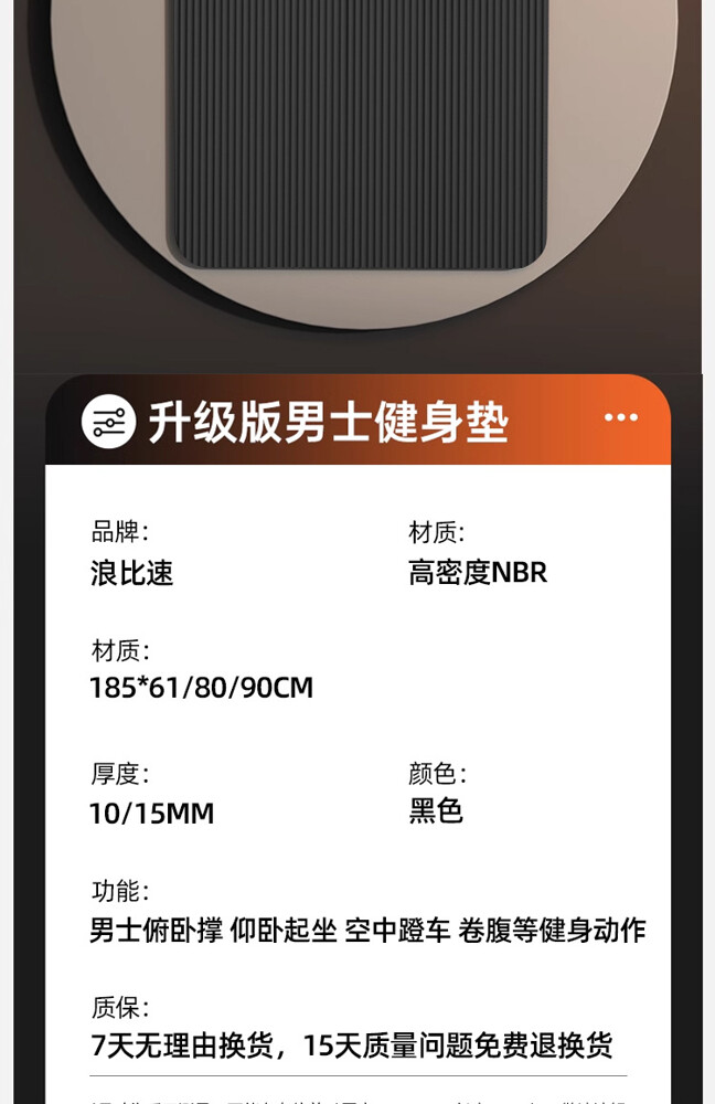 產品信息 材質:高密度NBR 浪比速 高密度NBR 尺寸:185*90CM 厚度:15MM 顔色:黑色 功能:男士俯臥撐仰臥起坐空中蹬車卷腹等健身動作 *尺寸爲手工測量,可能存在偏差(厚度±1~3mm、長寬±3cm),敬請諒解