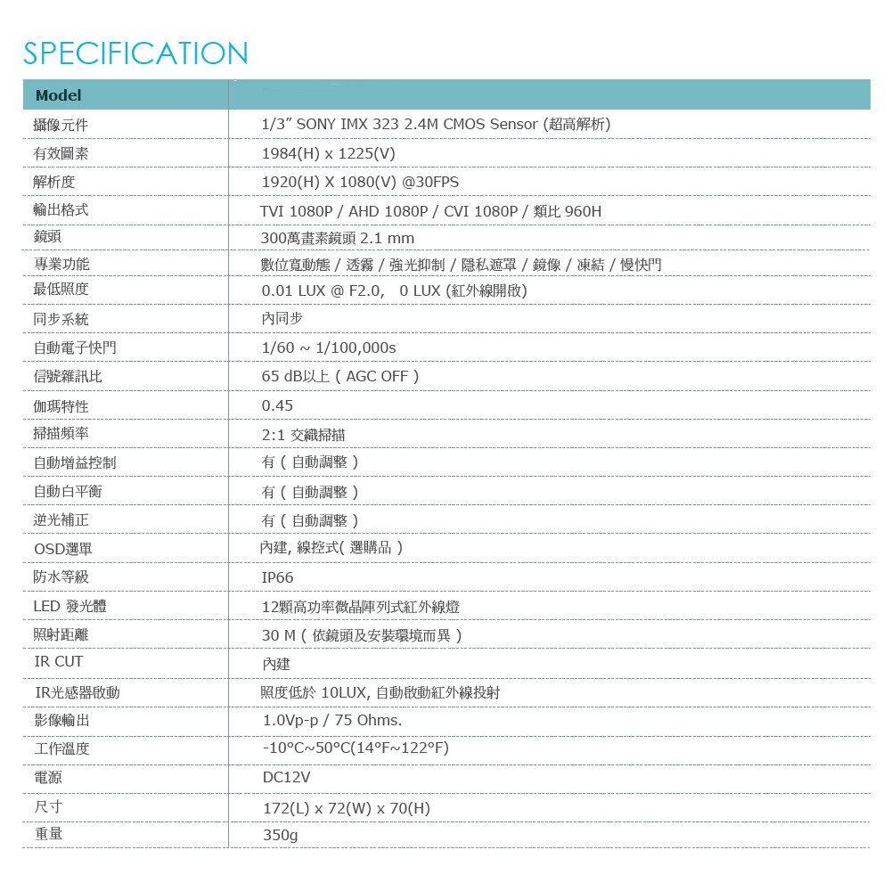 TVI 1080P / AHD 1080P / CVI 1080P / 類比 960H 輸出選擇