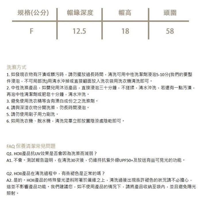 – 規格(公分):帽緣深度12.5 / 帽高18 / 頭圍58