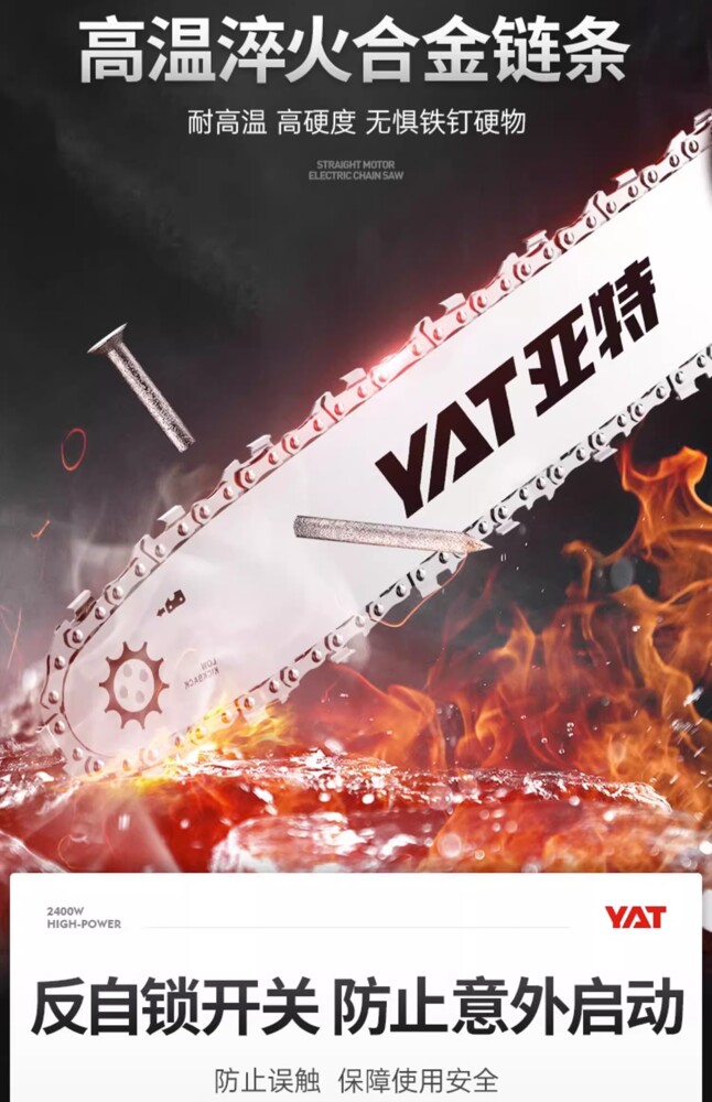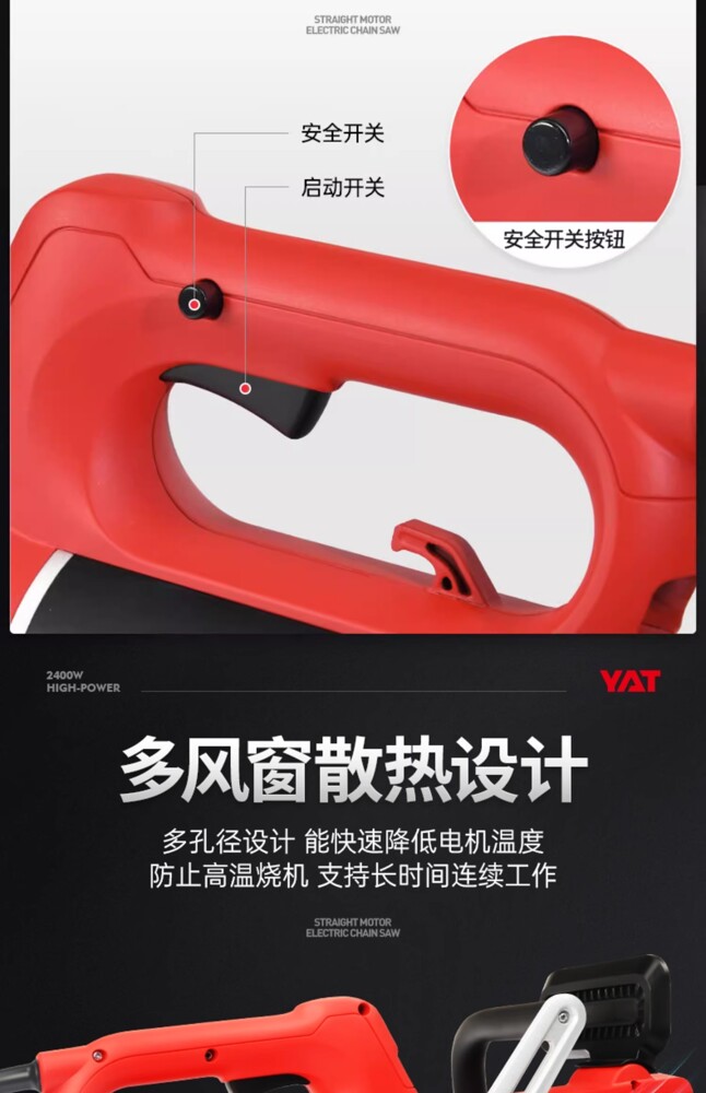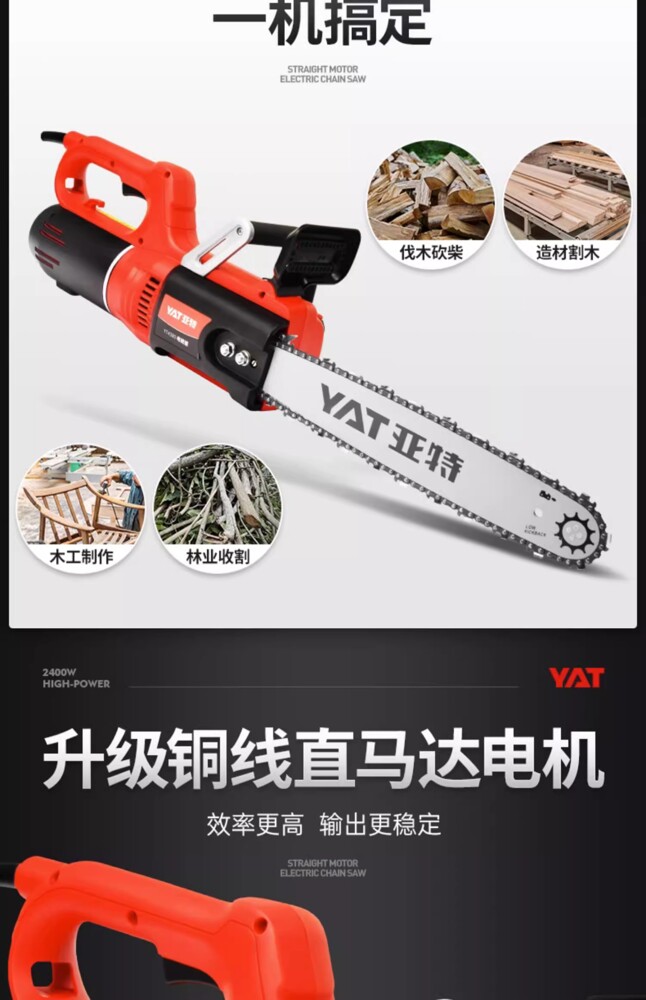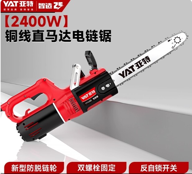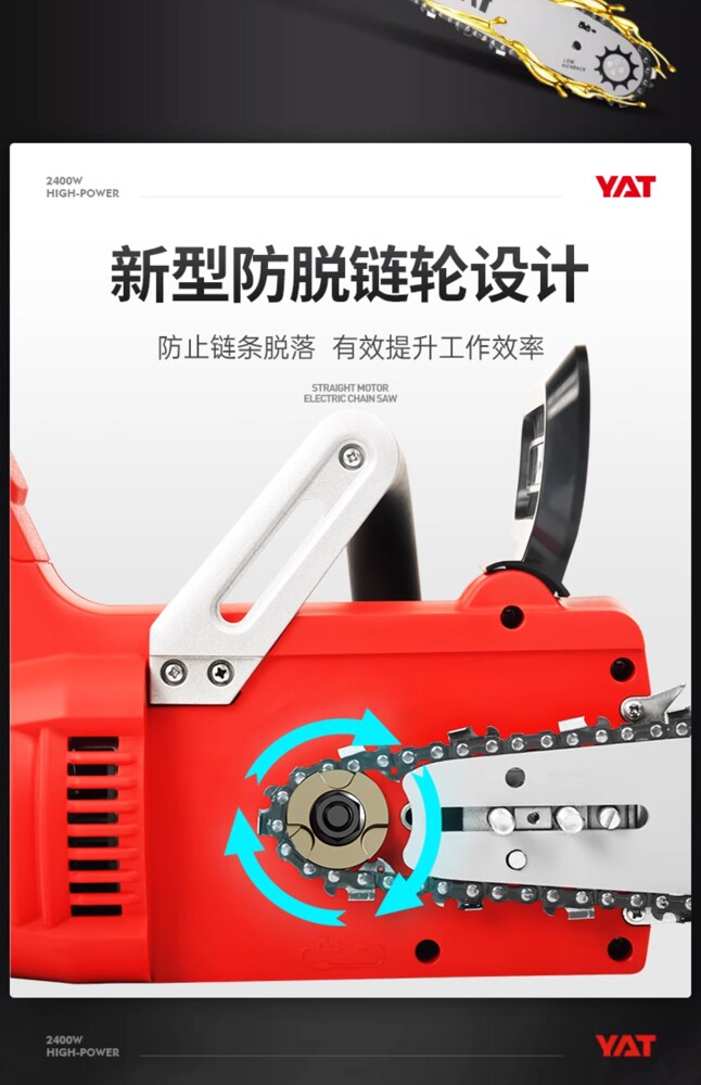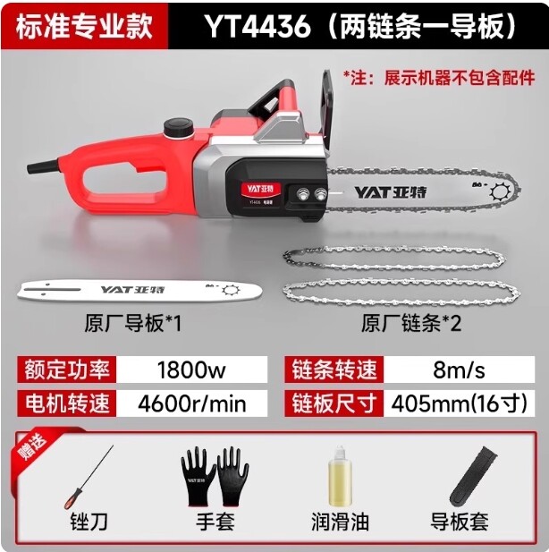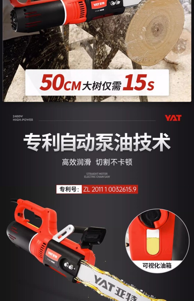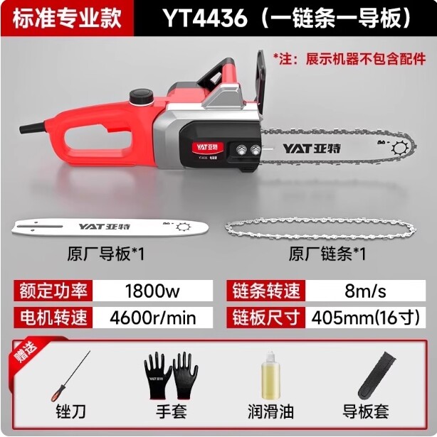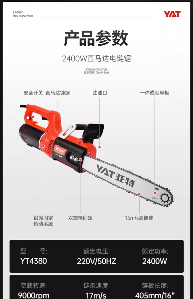 型號:YT4380 額定電壓:220v/50Hz 額定功率:2400w 空載轉速:9000rpm 鏈條速度:17m/s 鏈板長度:405mm/16 自動油泵:有 油箱容量:200ml 機器重量:4.5kg