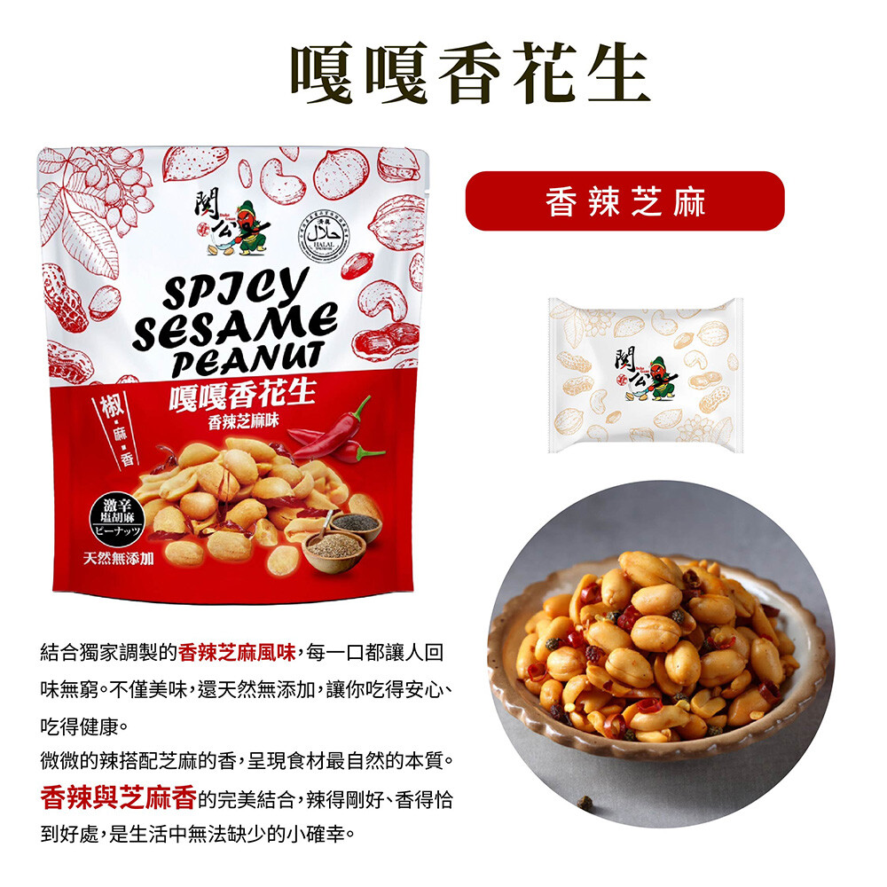 如果美味也能安心,那一定是 嘎嘎香花生。我們嚴選雲林北港的大花生,顆顆飽滿香脆,結合獨家調製的香辣芝麻風味,