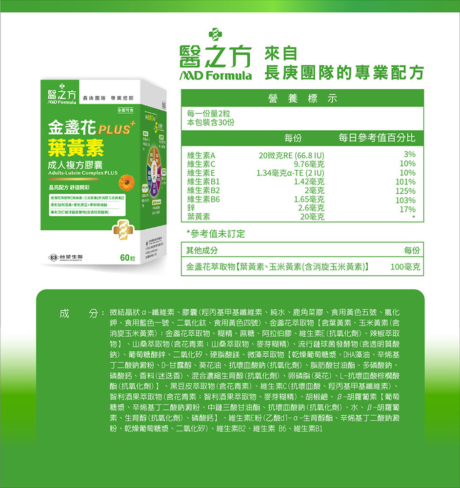 營養標示:(每一份量2粒本包裝含30份)維生素A 20微克RE (66.8 IU),維生素C 9.76毫克,維生素E 1.34毫克α-TE (2 IU),維生素B1 1.42毫克,維生素B2 2毫克,維生素B6 1.65毫克,鋅 2.6毫克,葉黃素 20毫克