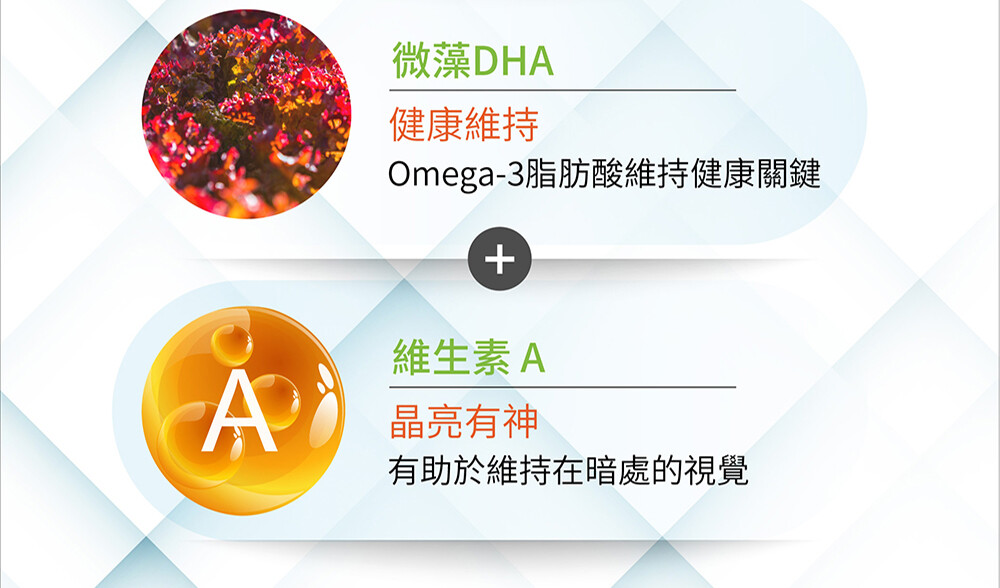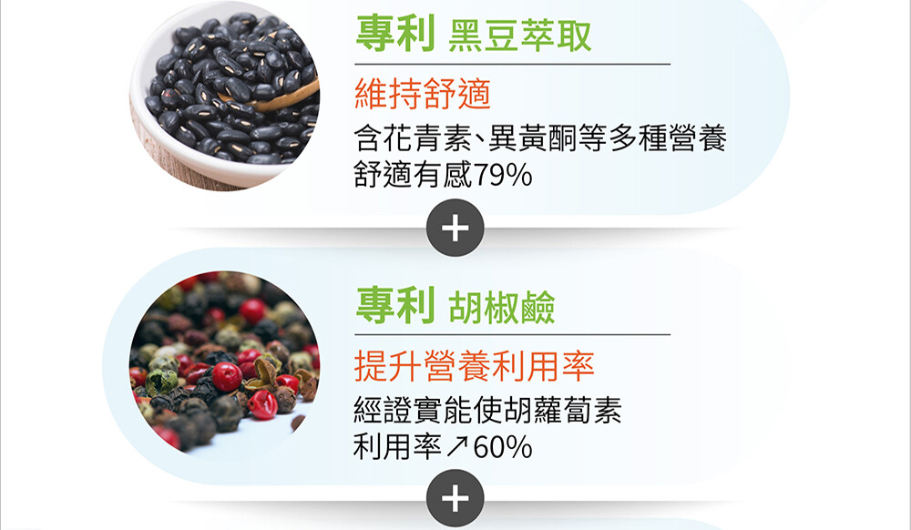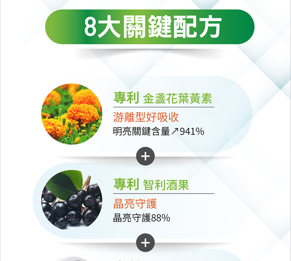 成 份:微結晶狀α-纖維素、膠囊(羥丙基甲基纖維素、純水、鹿角菜膠、食用黃色五號、氯化鉀、食用藍色一號、二氧化鈦、食用黃色四號)、金盞花萃取物【含葉黃素、玉米黃素(含消旋玉米黃素);金盞花萃取物、糊精、蔗糖、阿拉伯膠、維生素E(抗氧化劑)、辣椒萃取物】、山桑萃取物(含花青素;山桑萃取物、麥芽糊精)、流行鏈球菌發酵物(含透明質酸鈉)、葡萄糖酸鋅、二氧化矽、硬脂酸鎂、微藻萃取物【乾燥葡萄糖漿、DHA藻油、辛烯基丁二酸鈉澱粉、D-甘露醇、葵花油、抗壞血酸鈉(抗氧化劑)、脂肪酸甘油酯、多磷酸鈉、磷酸鈣、香料(迷迭香)、混合濃縮生育醇(抗氧化劑)、卵磷脂(葵花)、L-抗壞血酸棕櫚酸酯(抗氧化劑)】、黑豆皮萃取物(含花青素)、維生素C(抗壞血酸、羥丙基甲基纖維素)、智利酒果萃取物(含花青素;智利酒果萃取物、麥芽糊精)、胡椒鹼、β-胡蘿蔔素【葡萄糖漿、辛烯基丁二酸鈉澱粉、中鏈三酸甘油酯、抗壞血酸鈉(抗氧化劑)、水、β-胡蘿蔔素、生育醇(抗氧化劑)、磷酸鈣】、維生素E粉(乙酸dl-α-生育醇酯、辛烯基丁二酸鈉澱粉、乾燥葡萄糖漿、二氧化矽)、維生素B2、維生素 B6、維生素B1