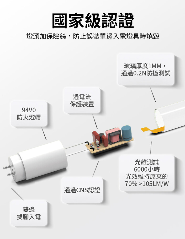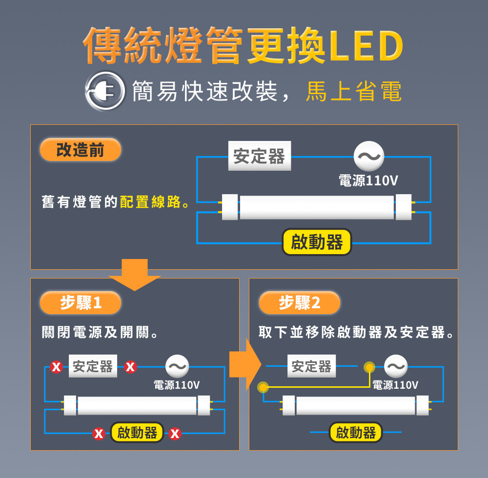 ※為避免觸電與起火,安裝LED燈管前應確認燈具是否有「適用安定器內藏型LED燈管」之標示