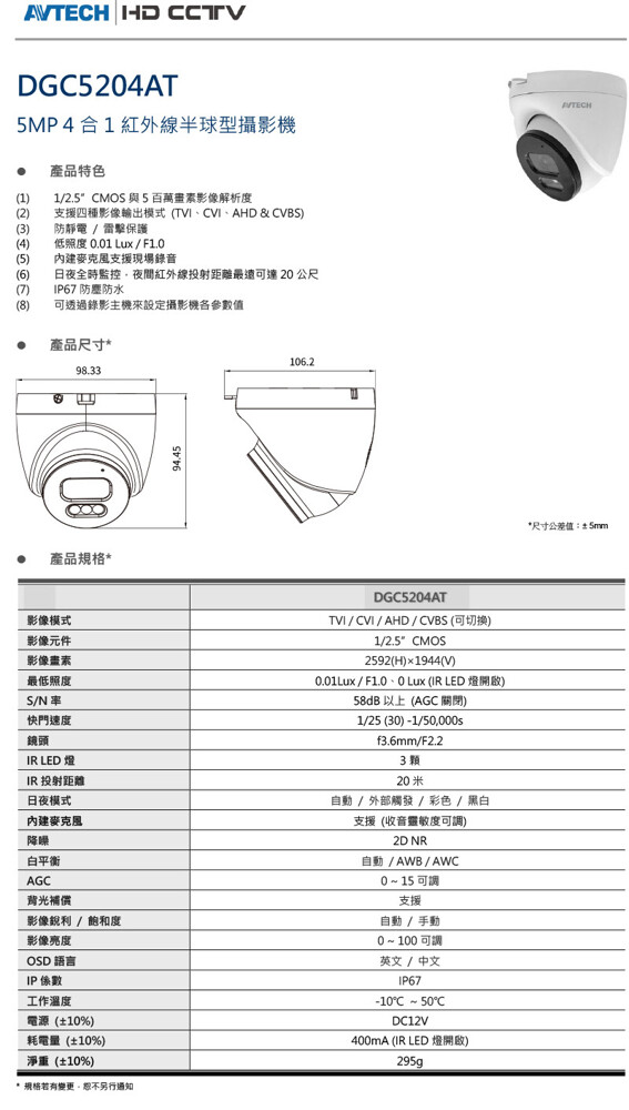 AVTECH 陞泰 帝網監視器 DGC5204AT 500萬 同軸聲音 四合一 半球紅外線攝影機