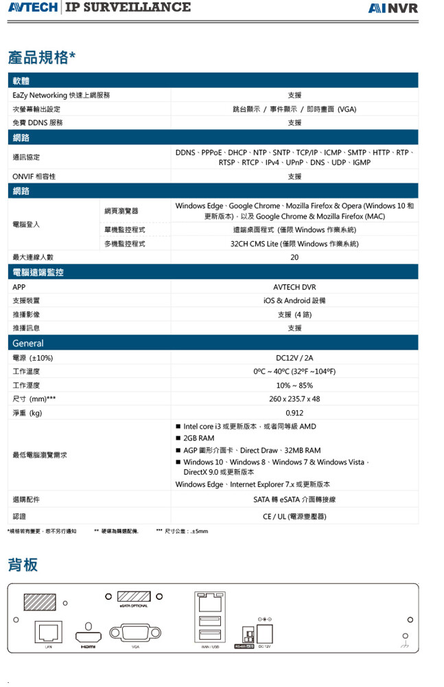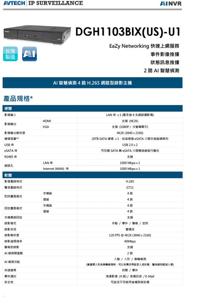 AVTECH 陞泰 DGH1103BIX-U1 4路 NVR AI偵測 4K 800萬 網路型 監