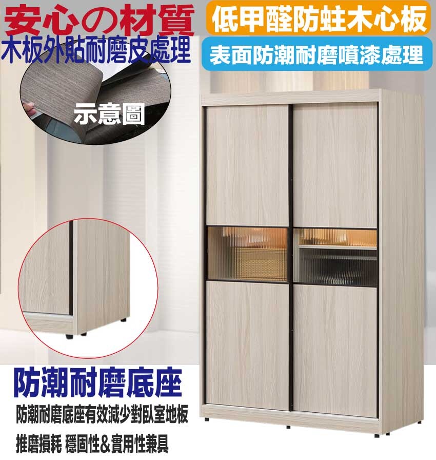 【綠家居】希望4尺推門衣櫃 淺橡木紋色系+安心材質製造,使用放心+搭配居家更便利,採用防蛀木心板+防潮耐磨底座+5mm直紋強化玻璃等安心材質製造 ,外層採用防潮耐磨噴漆處理搭配採用推門櫃+吊衣桿+內開放層格等收納空間設計,全由專人配送到家,專業安心服務,替你省下更多時間!