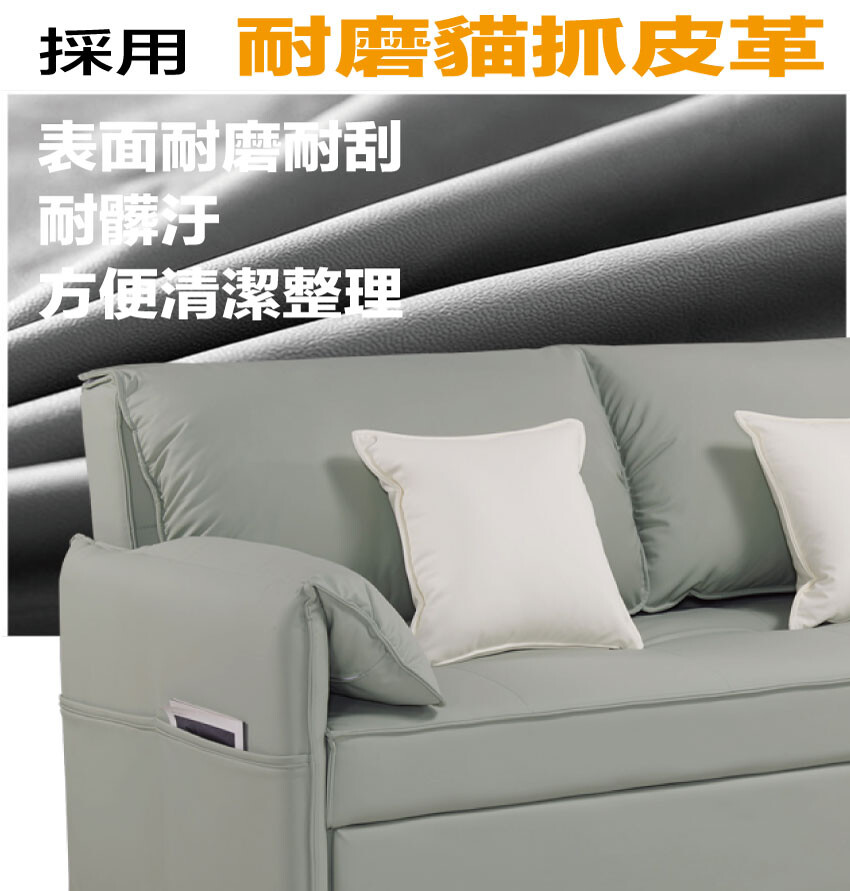 採用防鏽鋼管結構&不鏽鋼五金結構+便利滑輪設置+高回彈力加厚泡棉+耐磨貓抓皮革等安心材質