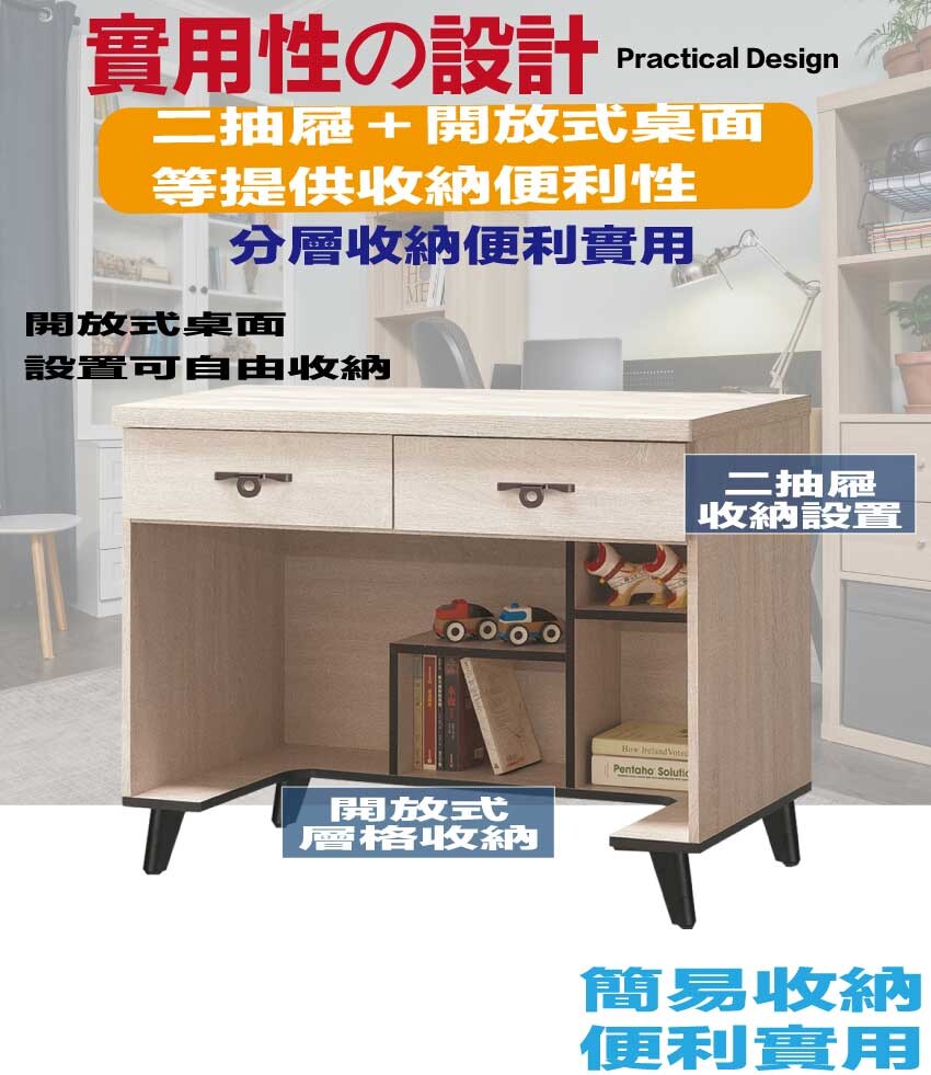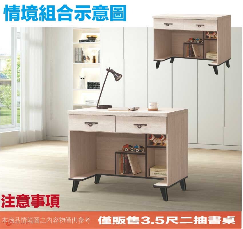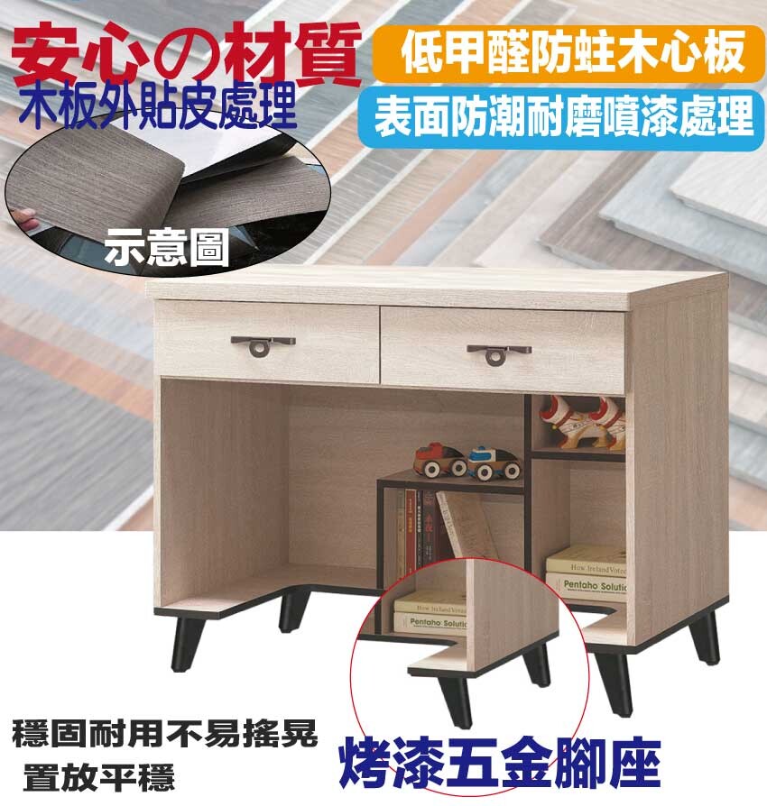 【綠家居】米砂3.5尺二抽書桌 淺橡木紋色系+安心材質製造,使用放心+搭配居家更便利,採用防蛀木心板+烤漆五金腳座+五金滑軌結構等安心材質製造 ,外層採用防潮耐磨噴漆處理搭配採用二抽屜+開放層格等收納空間設計,全由專人配送到家,專業安心服務,替你省下更多時間!