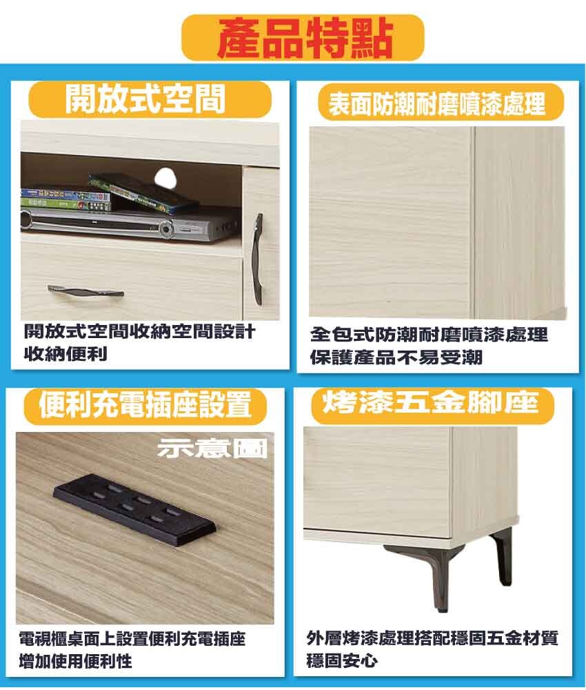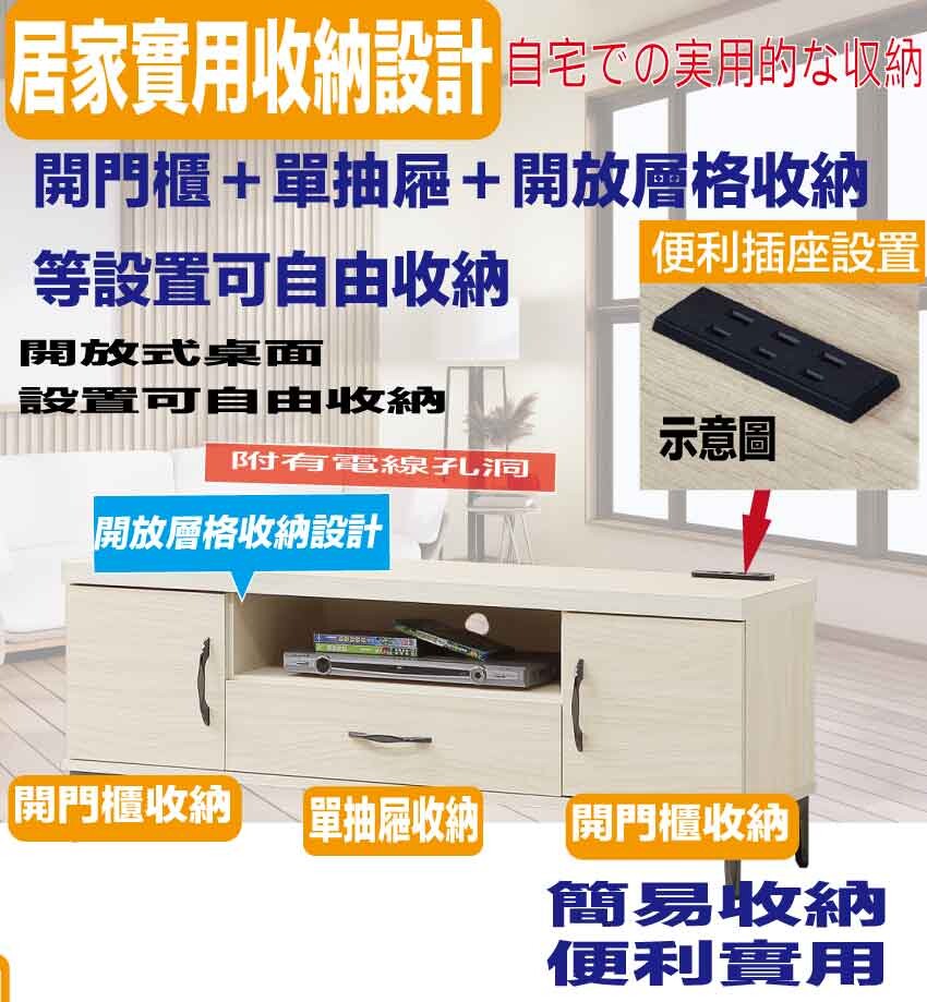 搭配採用開門櫃+單抽屜+開放層格+桌面設有插座等收納空間設計