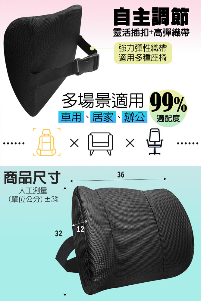 適用於辦公椅、駕駛座、輪椅或家用椅,隨時維持正確坐姿,守護您的腰部健康!