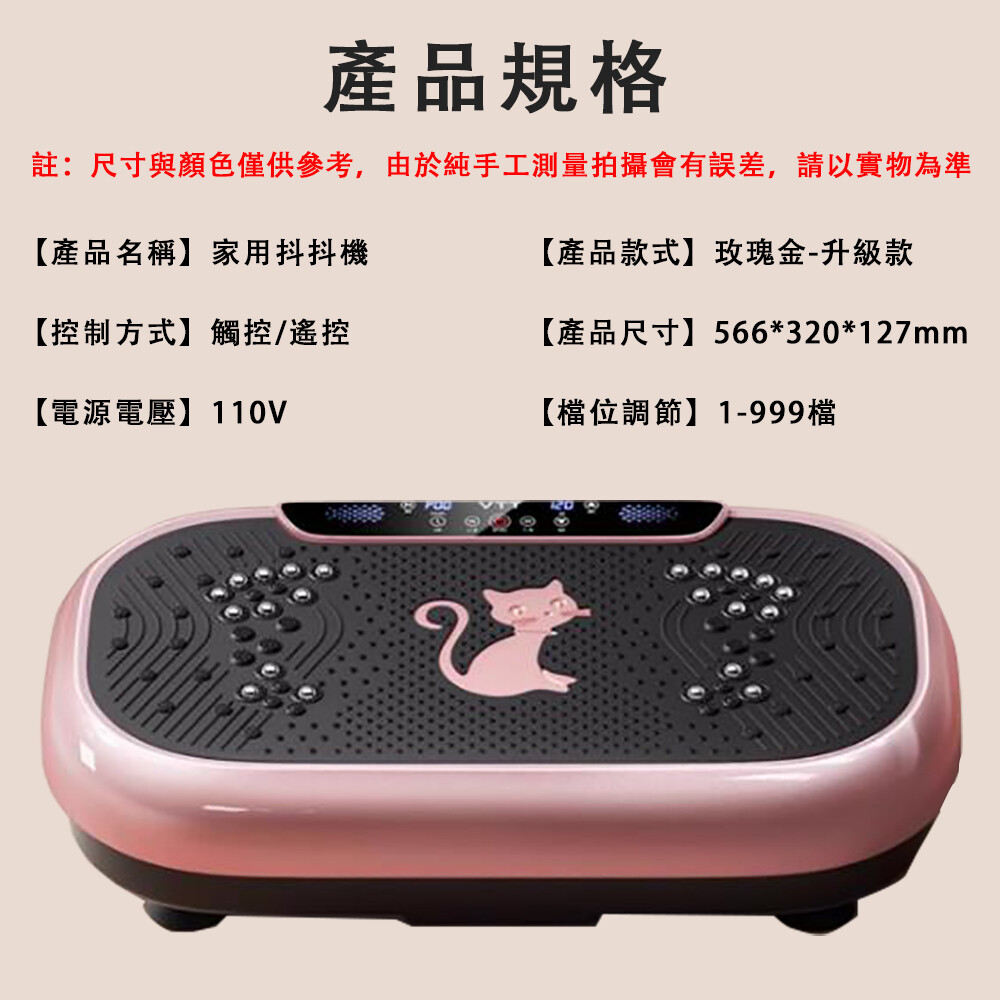 產品規格 往:尺寸與颜色僅供參考,由於纯手工測量拍操會有誤差,靖以實物為準 【產品名稠】家用抖抖機 【產品款式】玫璃金-升級款 [控制方式】觸控/遙控 [產品尺寸】566*320*127mm 【電源電壓】110V 【檔位調節】1-999檔