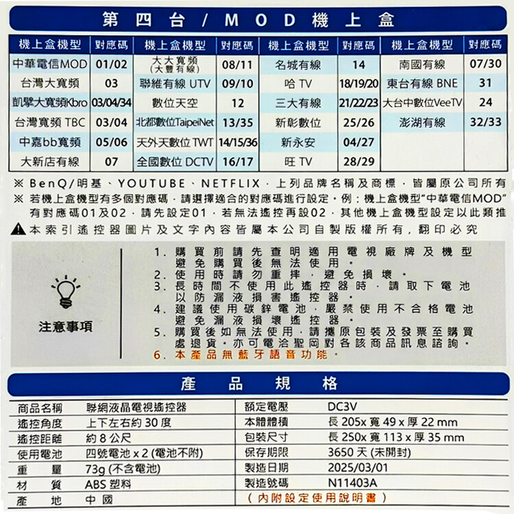 商品名稱:明碁聯網液晶電視遙控器