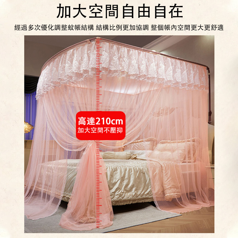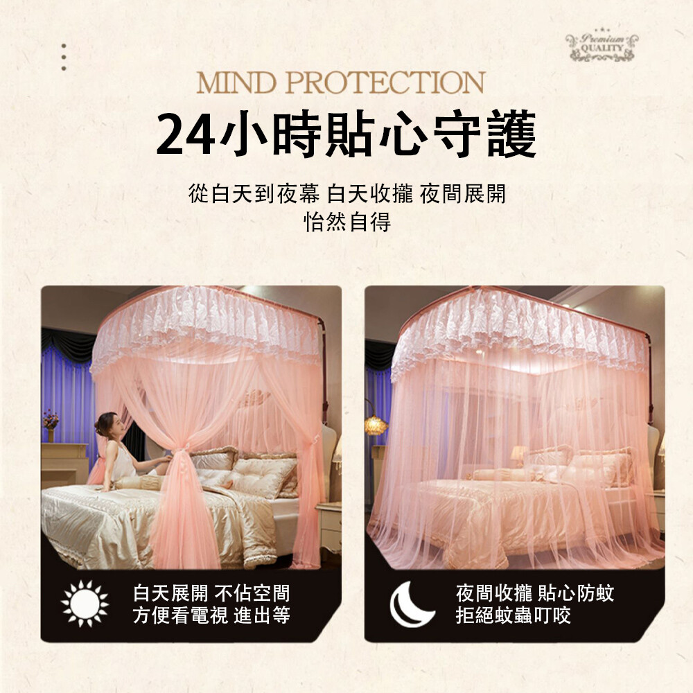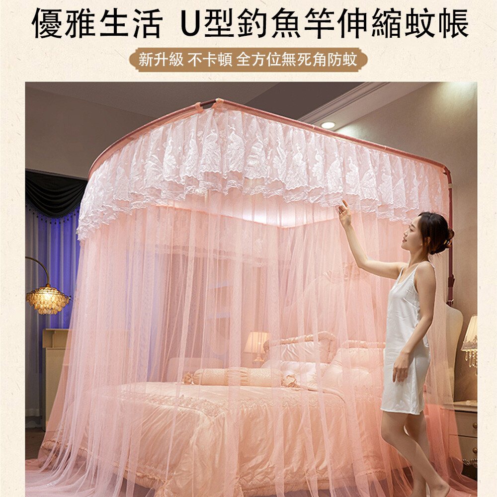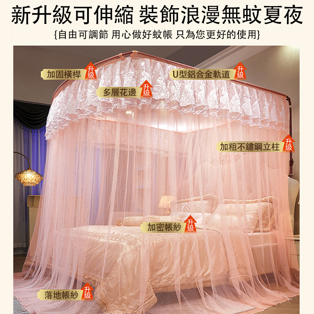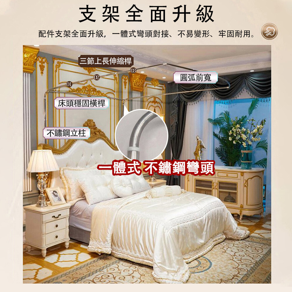 1:U型蚊帳床尾沒有支架,所以立柱必須安裝在床頭後面,且立柱