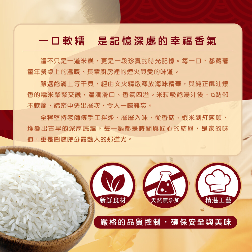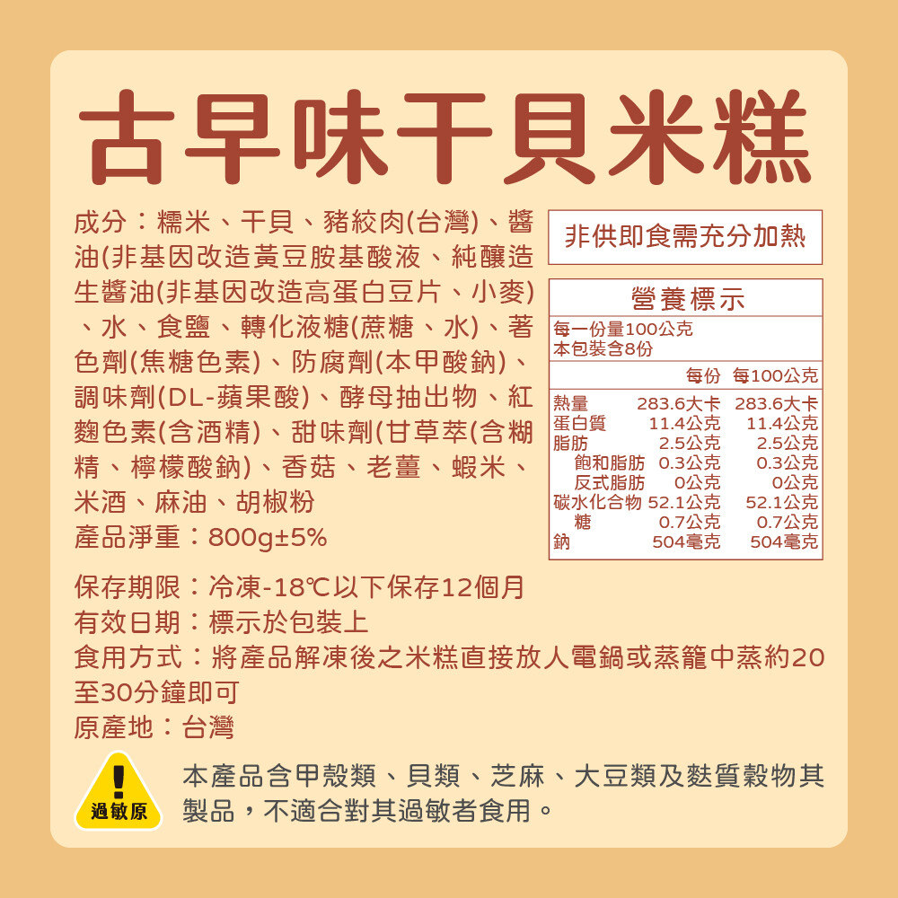 成分:糯米、干貝、豬絞肉(台灣)、醬油(非基因改造黃豆胺基酸液、純釀造生醬油(非基因改造高蛋白豆片、小麥)、水、食鹽、轉化液糖(蔗糖、水)、著色劑(焦糖色素)、防腐劑(本甲酸鈉)、調味劑(DL-蘋果酸)、酵母抽出物、紅麹色素(含酒精)、甜味劑(甘草萃(含糊精、檸檬酸鈉)、香菇、老薑、蝦米、米酒、麻油、胡椒粉