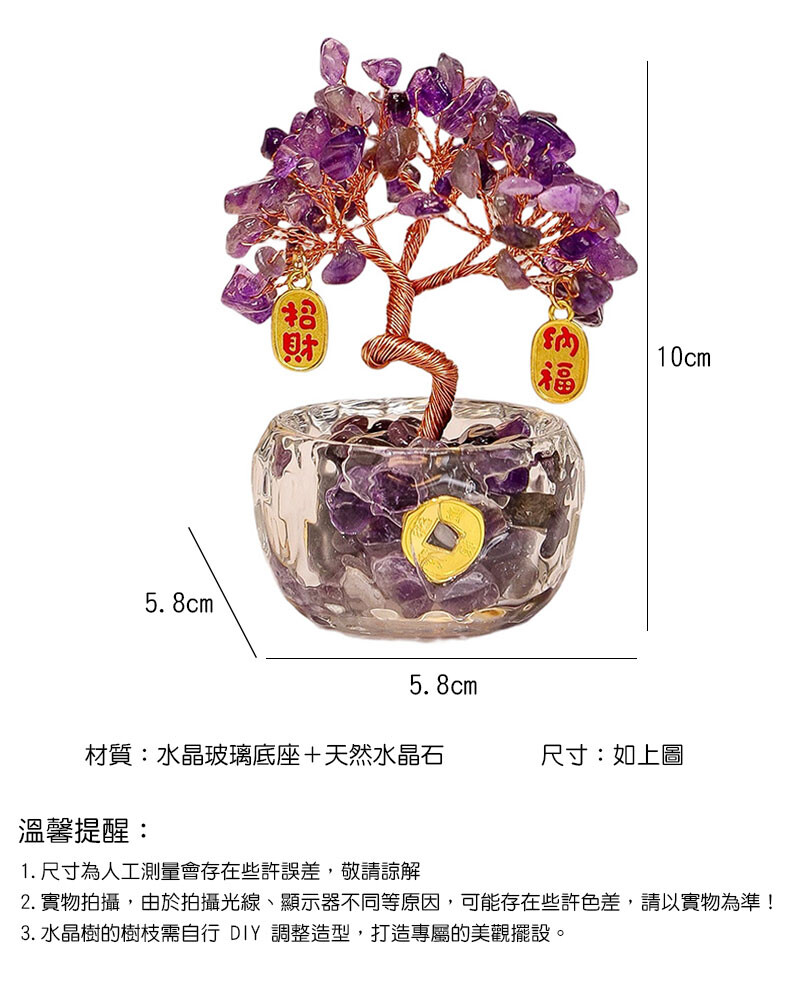 以聚寶盆為基座,搭配天然水晶樹枝,可自由調整造型。