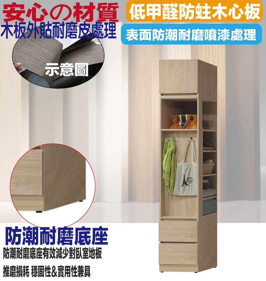【綠家居】唐斯1.3尺三抽開放加高側邊櫃/衣櫃組合 橡木紋色系+安心材質製造,使用放心+搭配居家更便利,採用防蛀木心板+防潮耐磨底座+五金滑軌結構等安心材質製造 ,外層採用防潮耐磨噴漆處理搭配採用開門櫃+吊衣桿+三抽屜+開放層格等收納空間設計,全由專人配送到家,專業安心服務,替你省下更多時間!