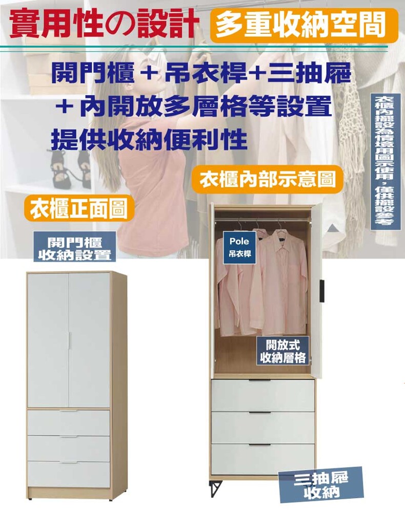 搭配採用開門櫃+吊衣桿+三抽屜+內開放層格等收納空間設計