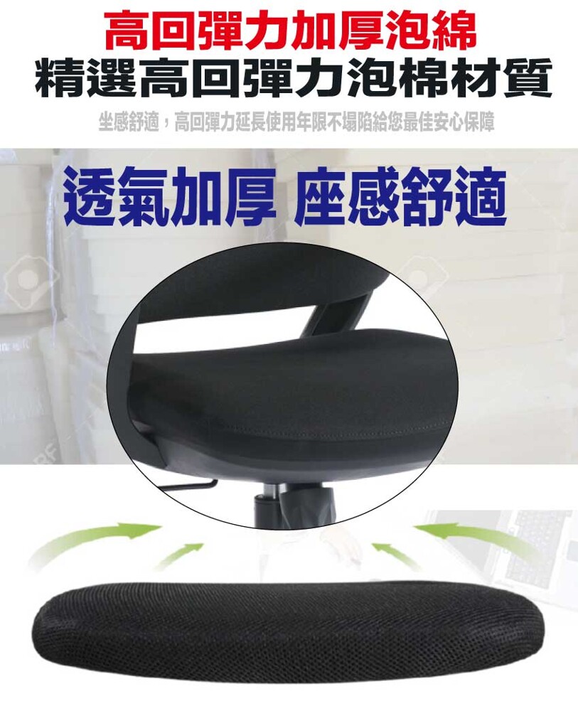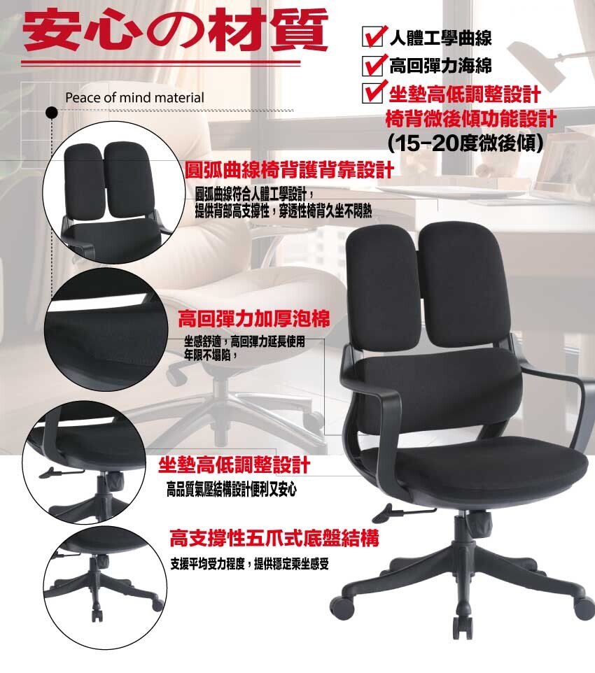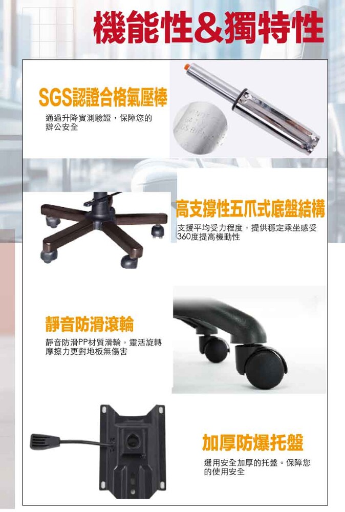 採用高剛性PP材質+高透氣強韌網布+五抓式底盤+防爆托盤架+高磅數氣壓棒+靜音防滑滾輪+高回彈性加厚泡棉等安心材質製造